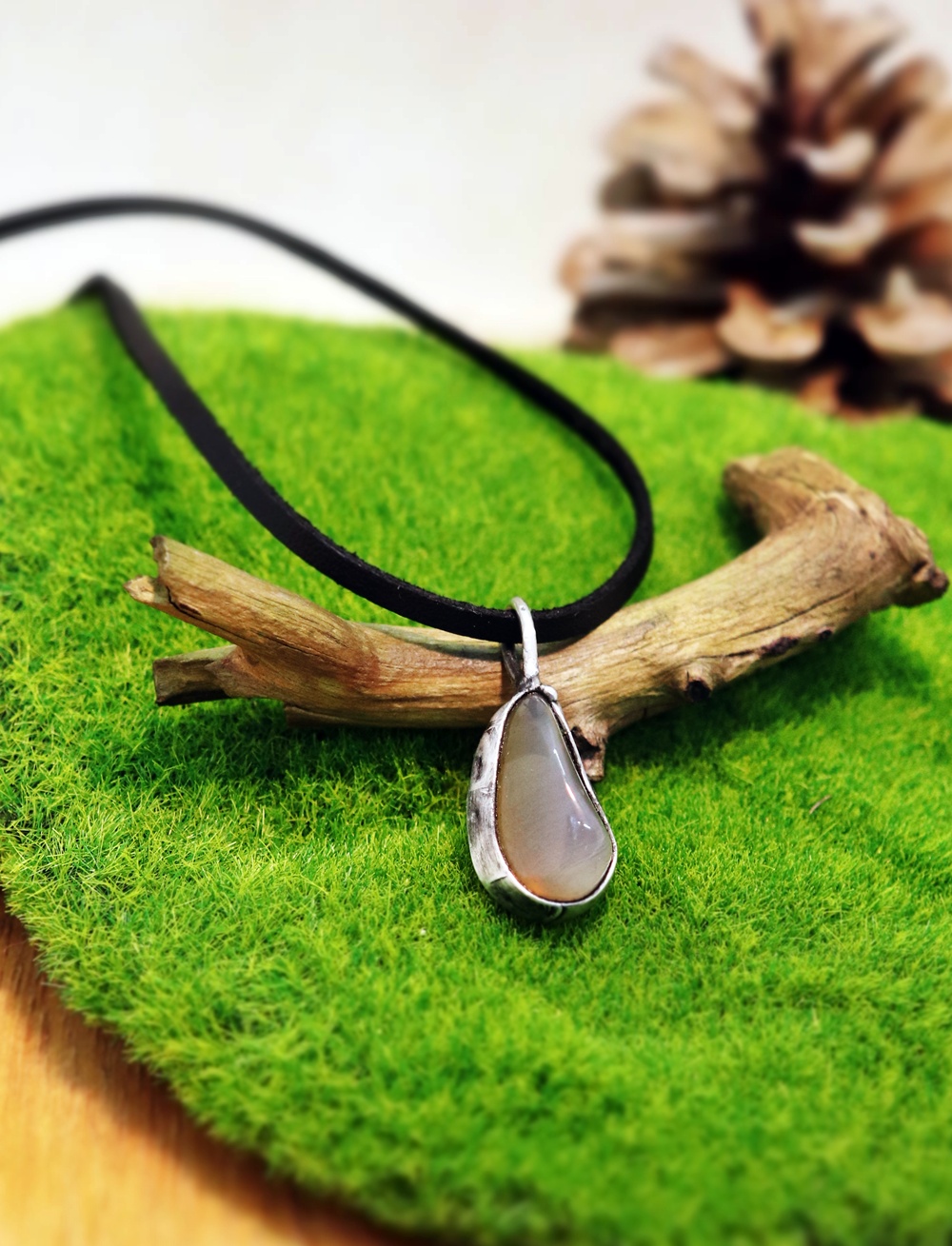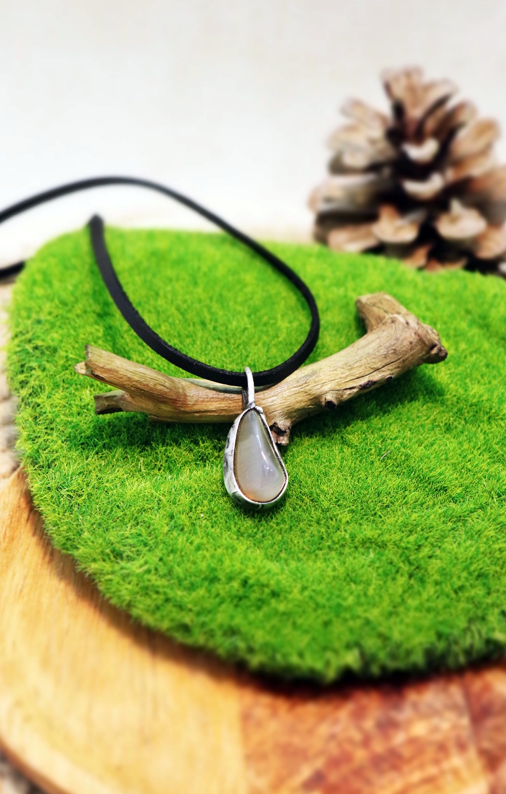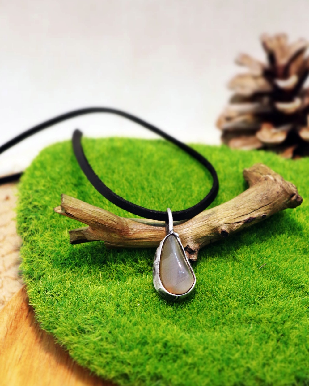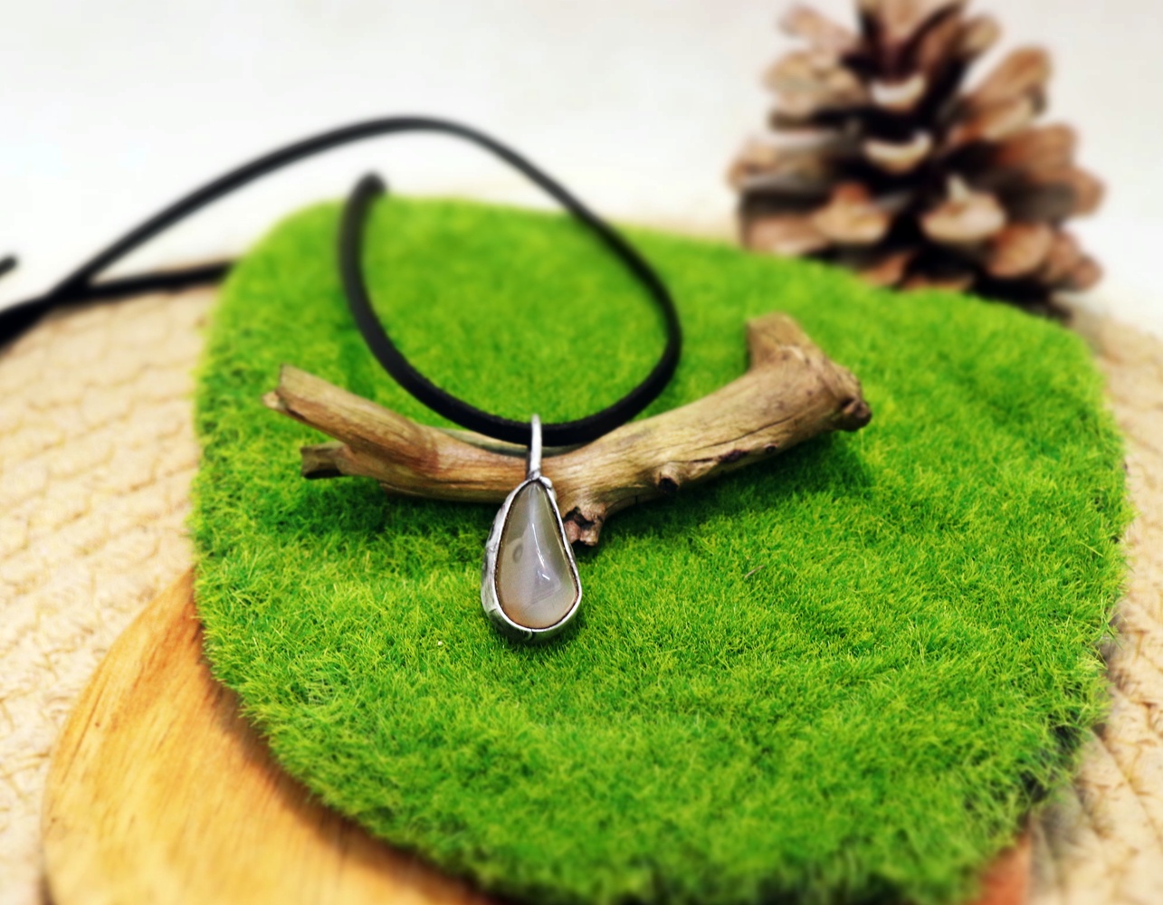 - Materiál: přírodní achát, cín bez obsahu olova s příměsí stříbra, kožená eko šňůrka o délce 80 cm