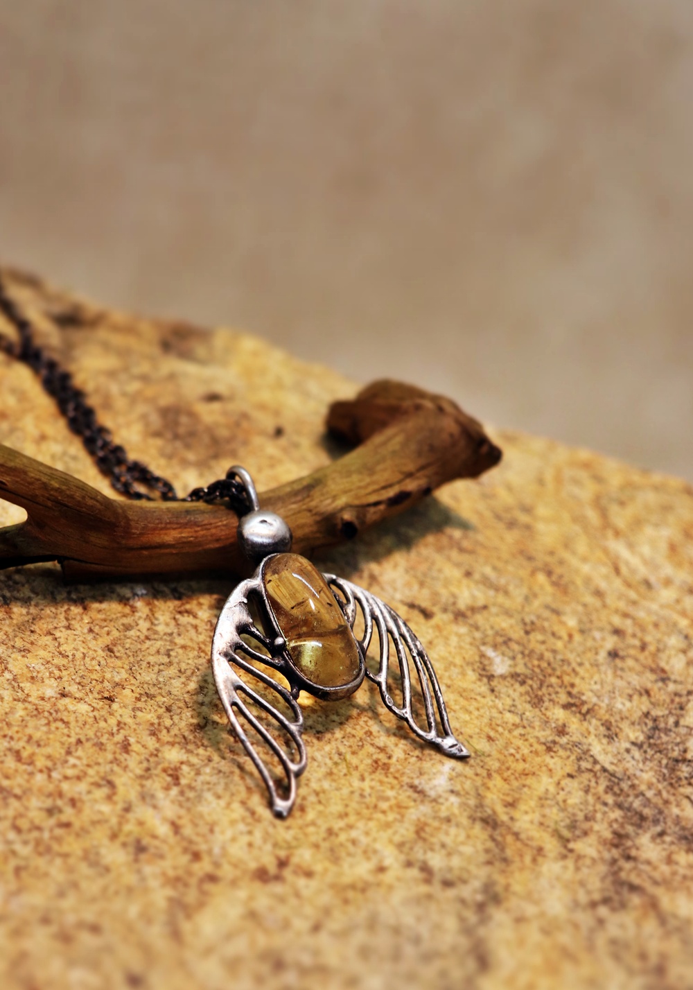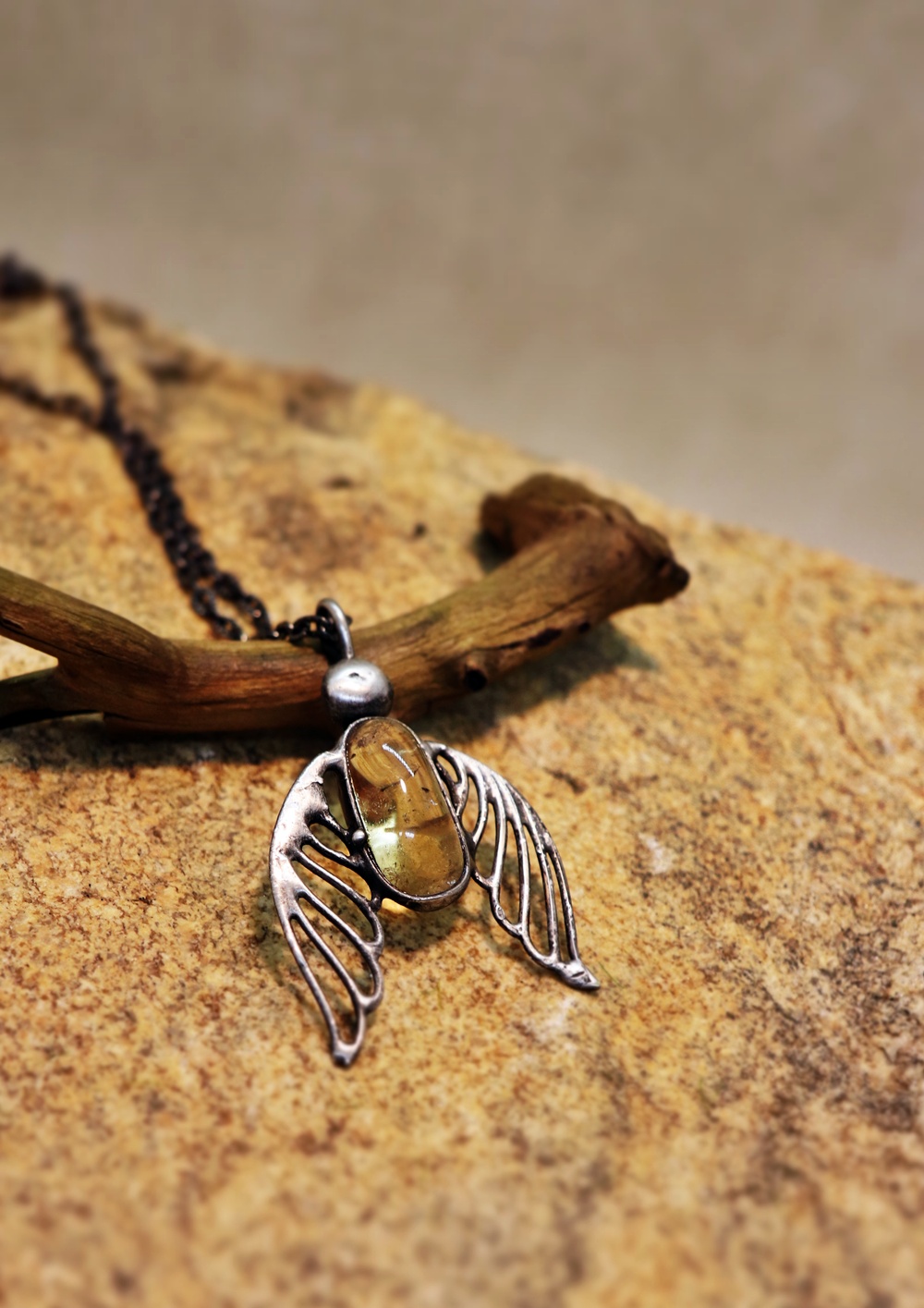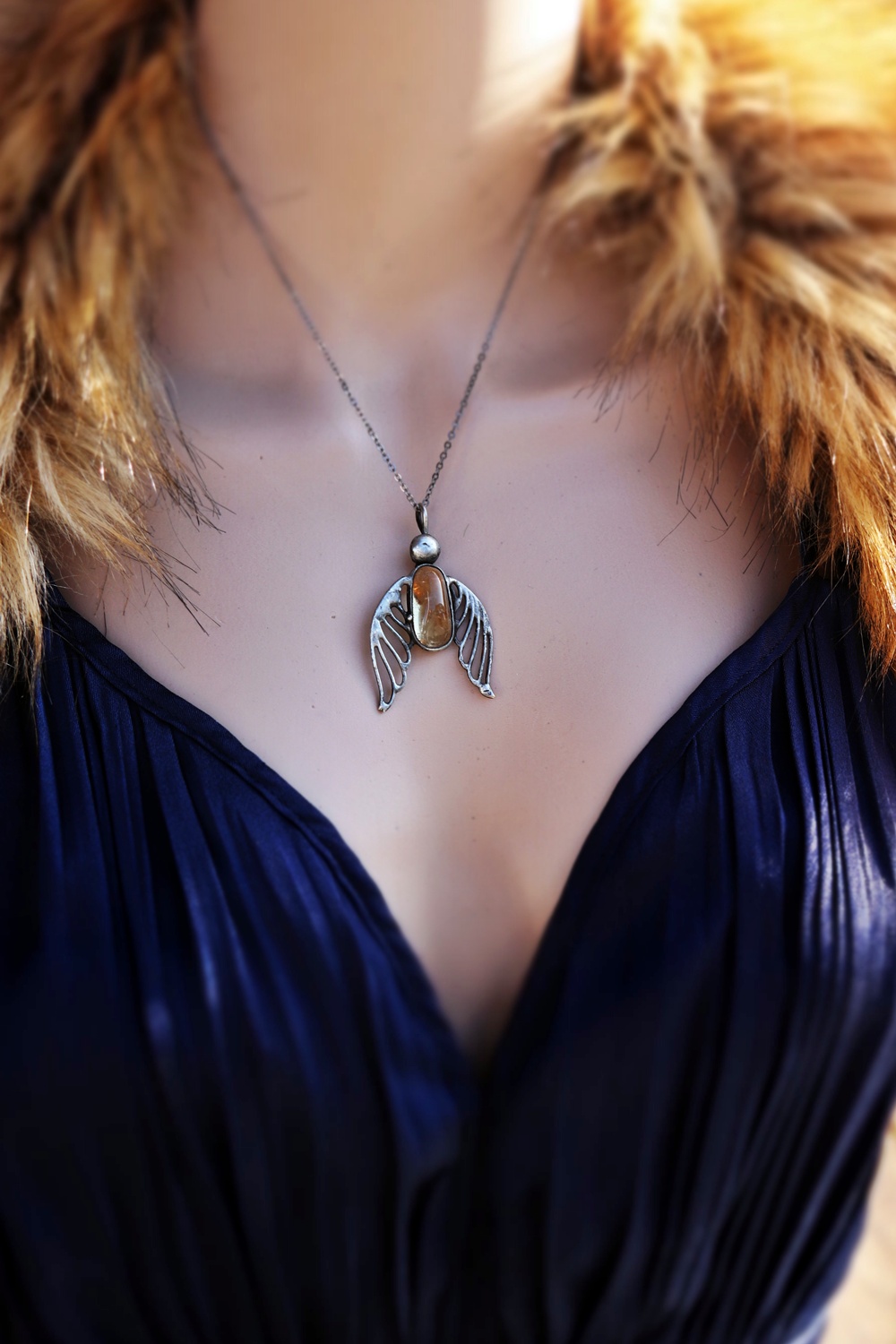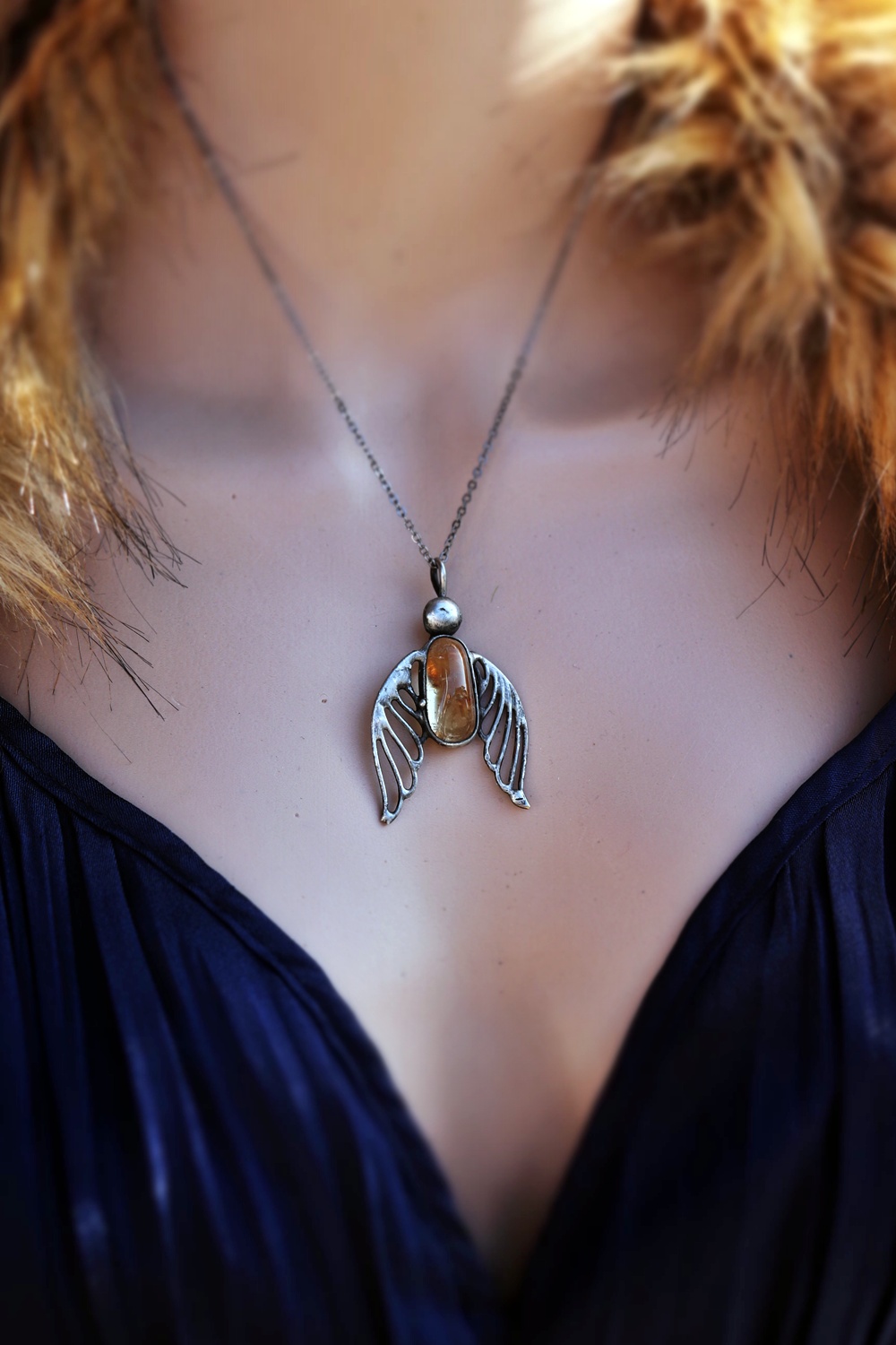 Síla ochrany a světla v jednom šperku. Tento cínovaný anděl s přírodním citrínem přináší do života radost, vitalitu a pozitivní energii. Každé křídlo je ručně tvarované tak a citrín uprostřed nádherně září v teplých zlatavých odlescích.