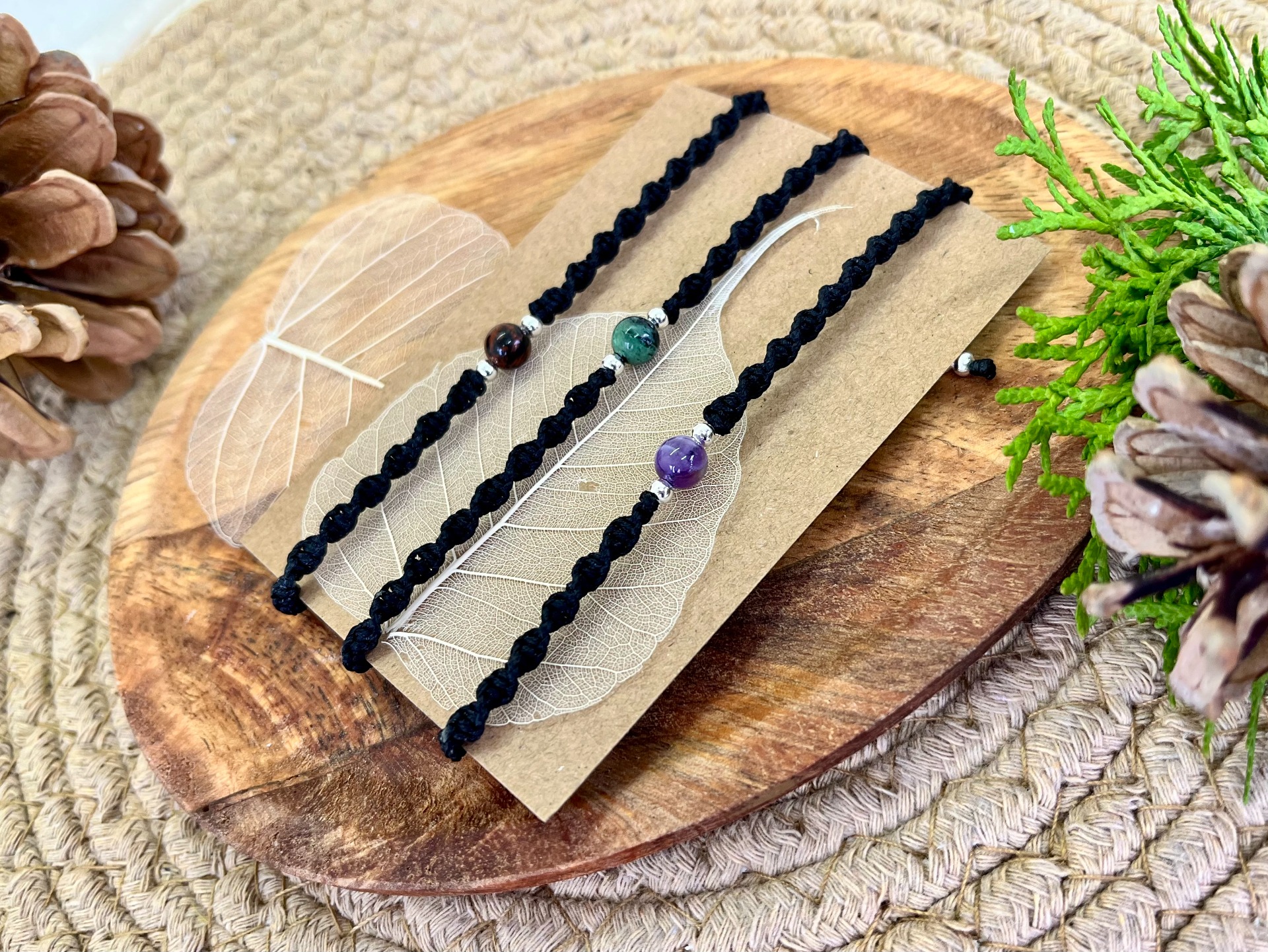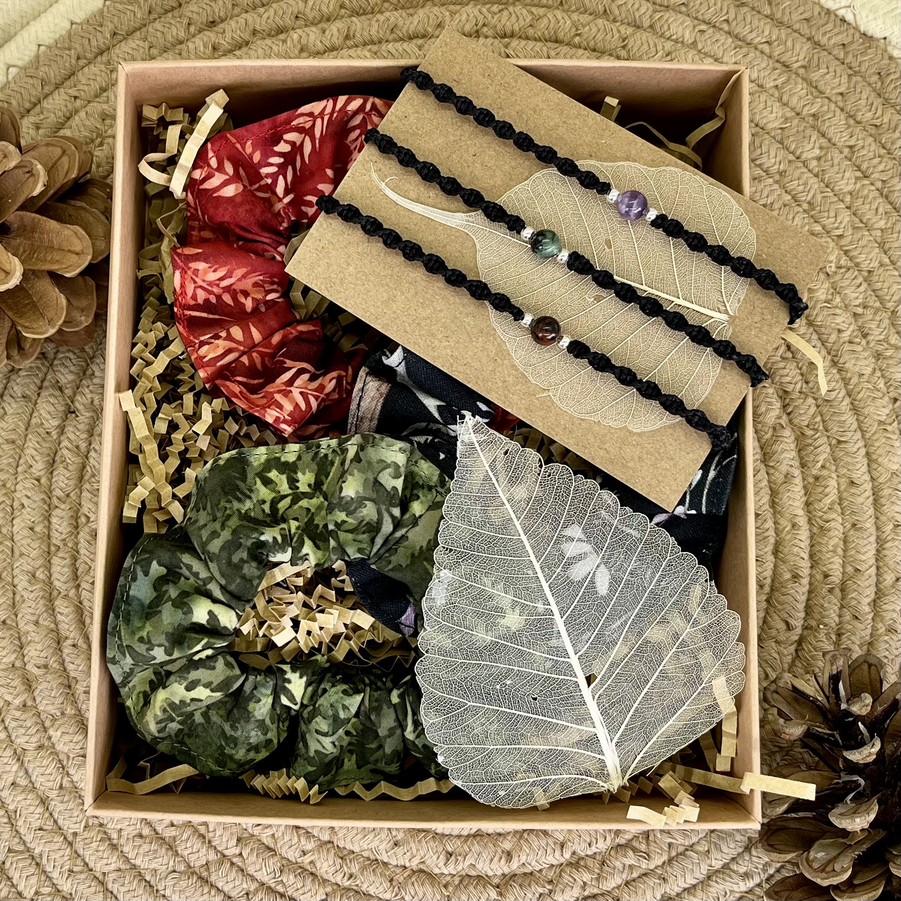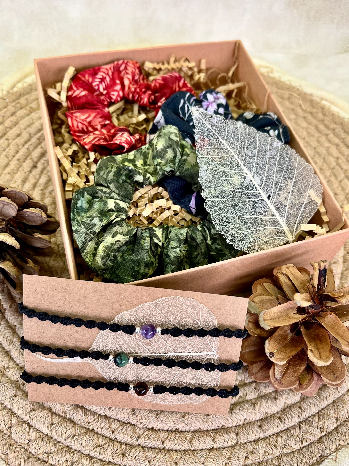 „Lesní bohyně“ je balíček inspirovaný divokostí přírody a její ochranitelskou energií. Tři scrunchie laděné do lesních tónů doplňují tři jemné náramky s minerálními korálky—ametystem pro klid duše, rubínem v zoisitu pro odvahu a mahagonovým obsidiánem pro stabilitu. Ideální dárek pro ženy, které milují magii přírody.