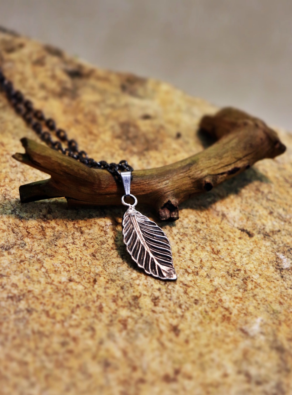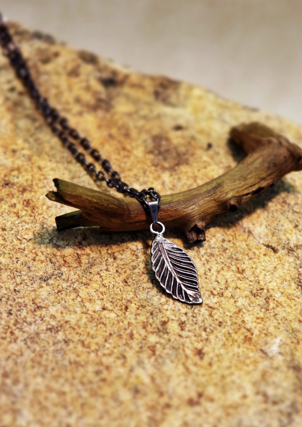 Lístek je zavěšen na patinovaném řetízku, který krásně podtrhuje jeho strukturu. Hodí se na běžné nošení i jako decentní doplněk k přírodním či boho outfitům.