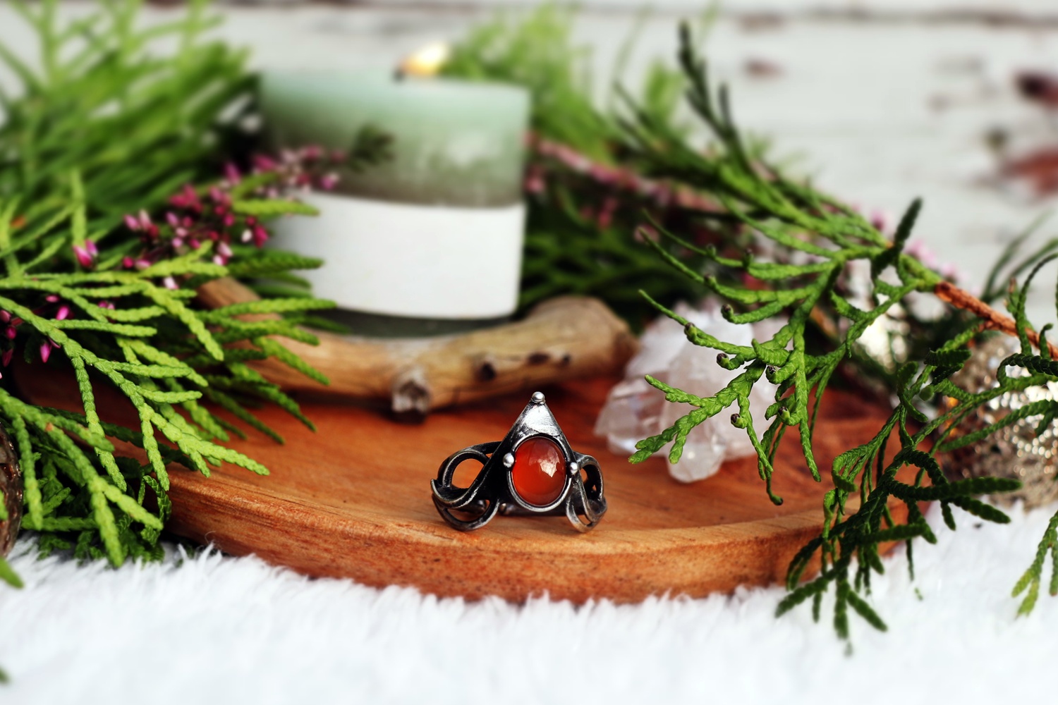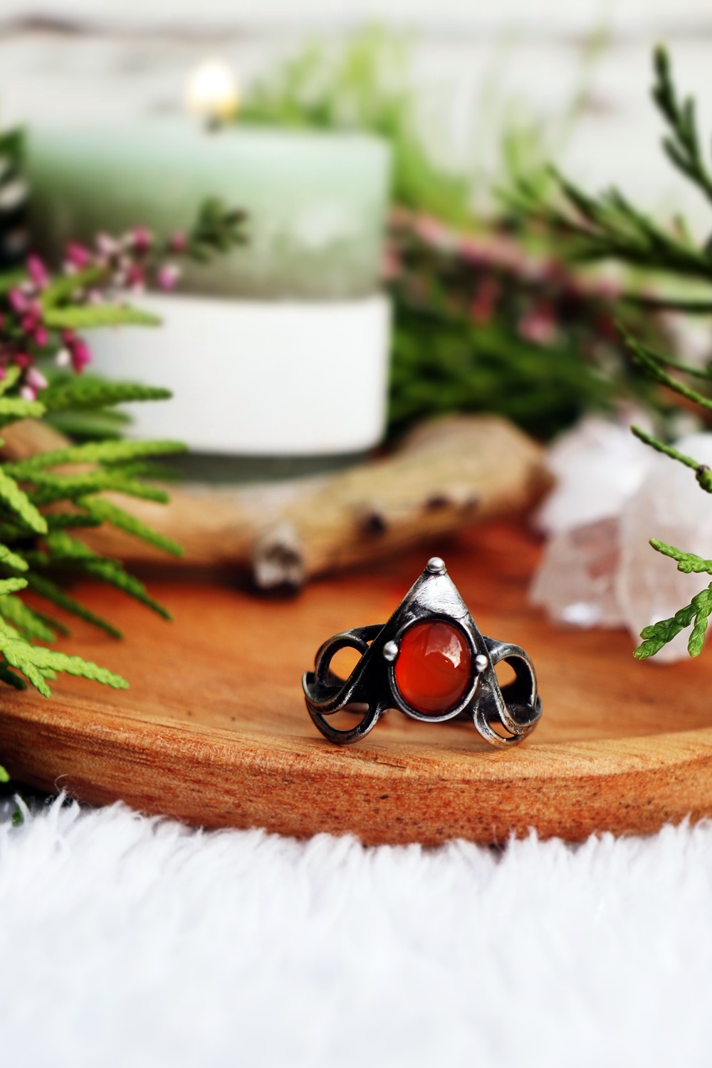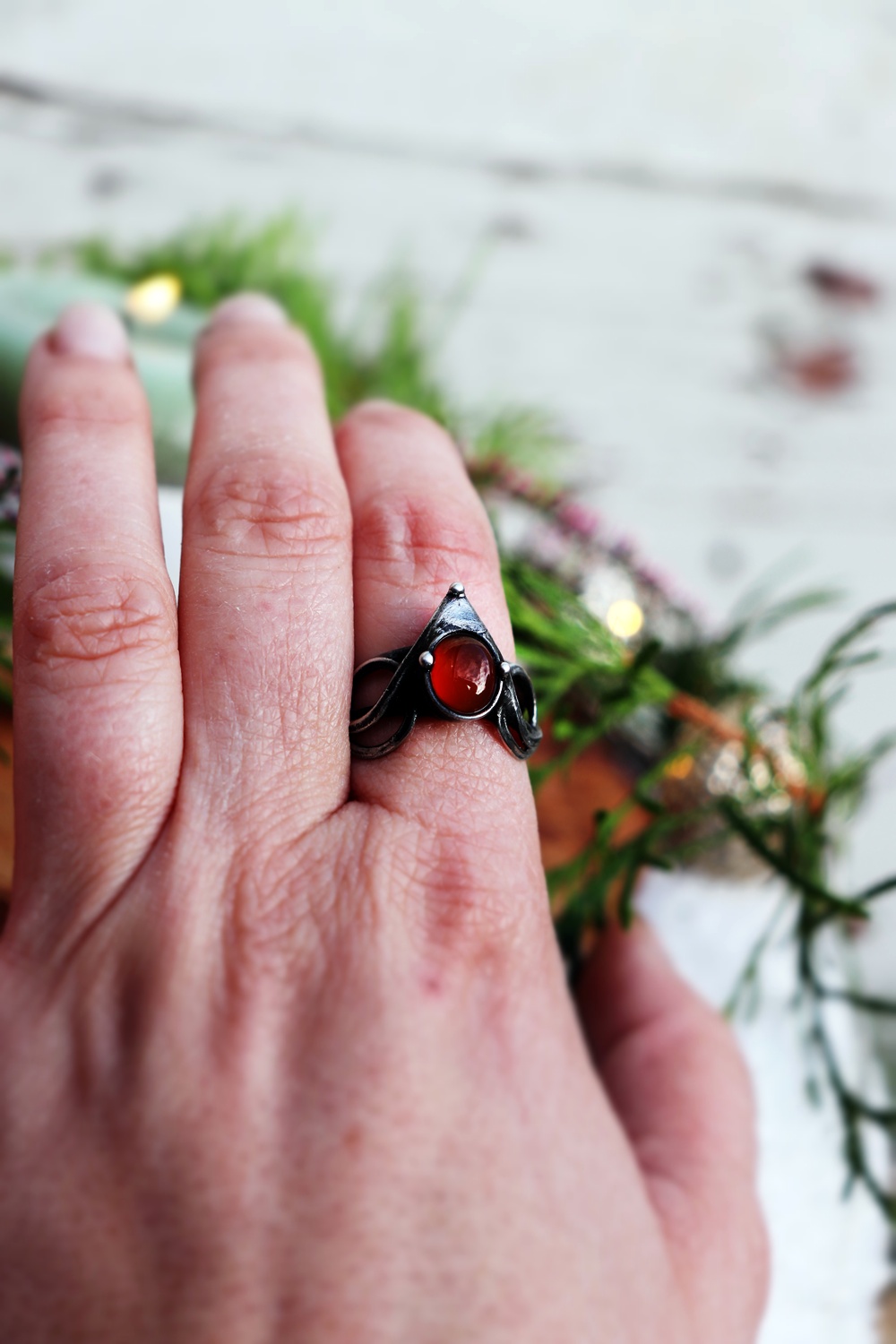Elegantní cínovaný prsten s karneolem, který dodá sebevědomí a energii. Každý prsten je originál, který propojuje ženskou sílu a zemitou stabilitu. Skvělý doplněk pro ženy, které chtějí vystoupit z davu a zazářit. Detaily: Materiál: karneol, cín s příměsí stříbra Velikost: kámen – 0,6 x 0,8 cm Barva: oranžová Ruční výroba: ano, každý kus je originál Hodí se pro: sebevědomé ženy nebo ty, které potřebují v sobě sílu znovu probudit. Znamení: Beran, Lev, Panna, Štír Afirmace: Žiji naplno tady a teď. Zabaleno v dárkové krabičce – připraveno k darování