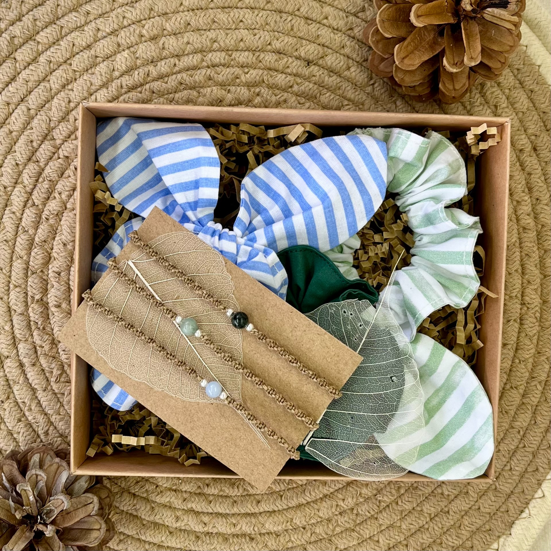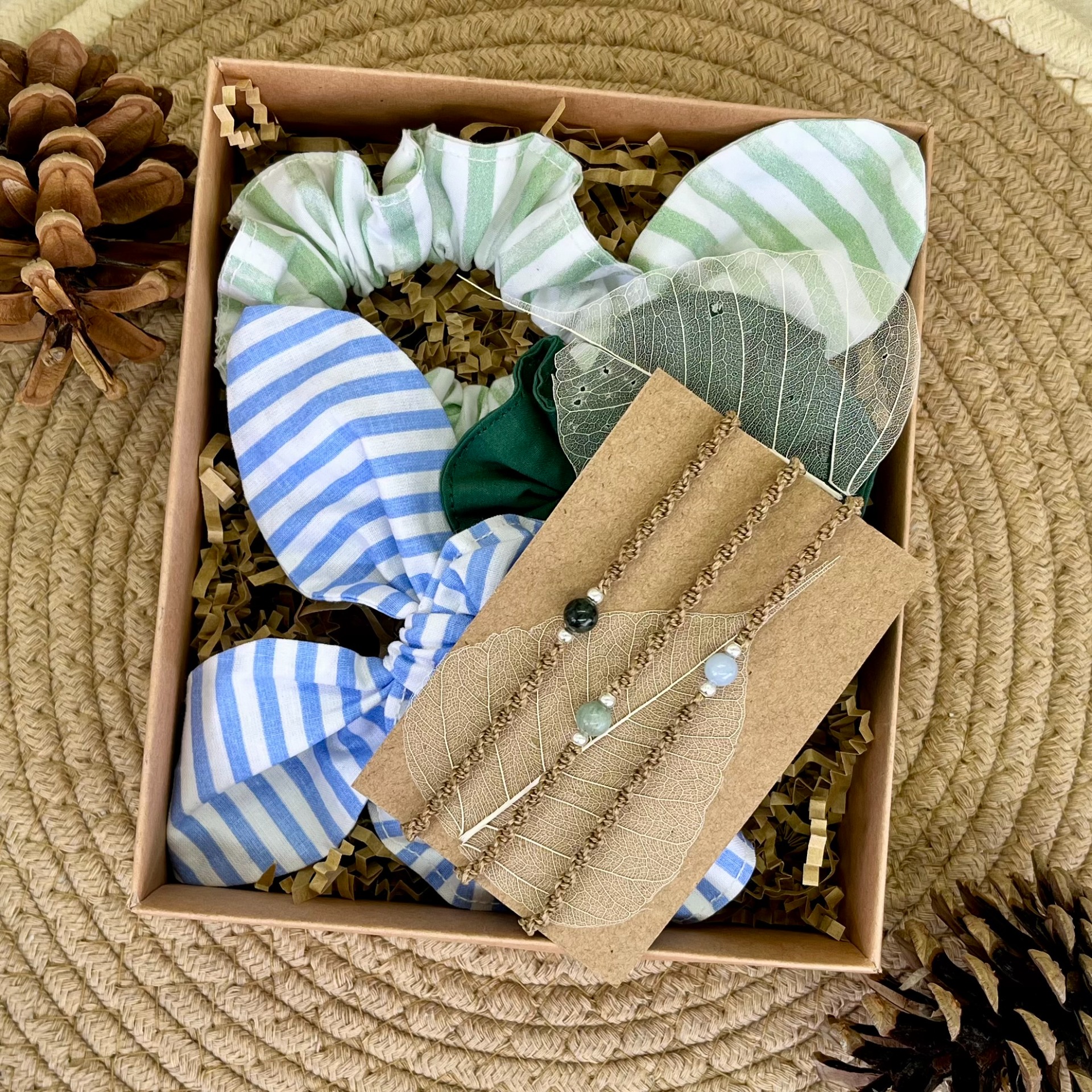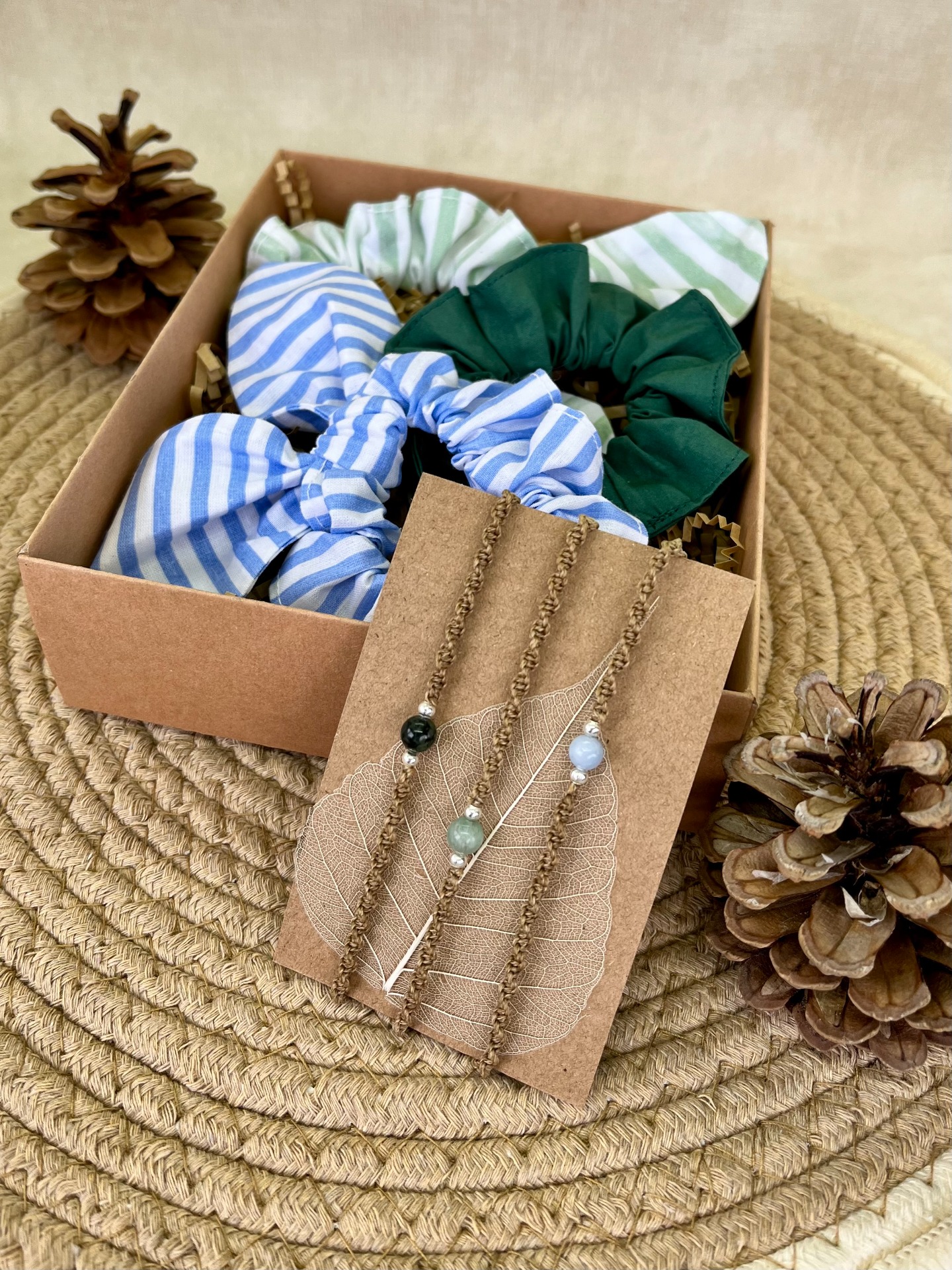 Dárková sada „Dotek venkova“ přináší jemnou atmosféru klidu, slunce a prosté radosti. Tři scrunchie v měkkých tónech doplňují tři náramky s minerály — angelitem pro mír, aventurínem pro štěstí a rubínem v zoisitu pro vitalitu. Laskavý dárek pro milovnice venkova, tradic a jednoduché krásy.