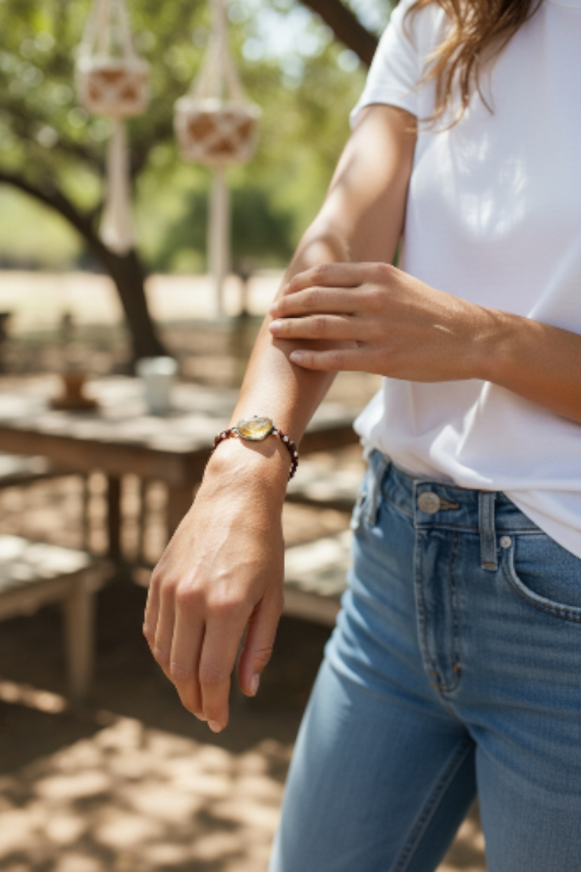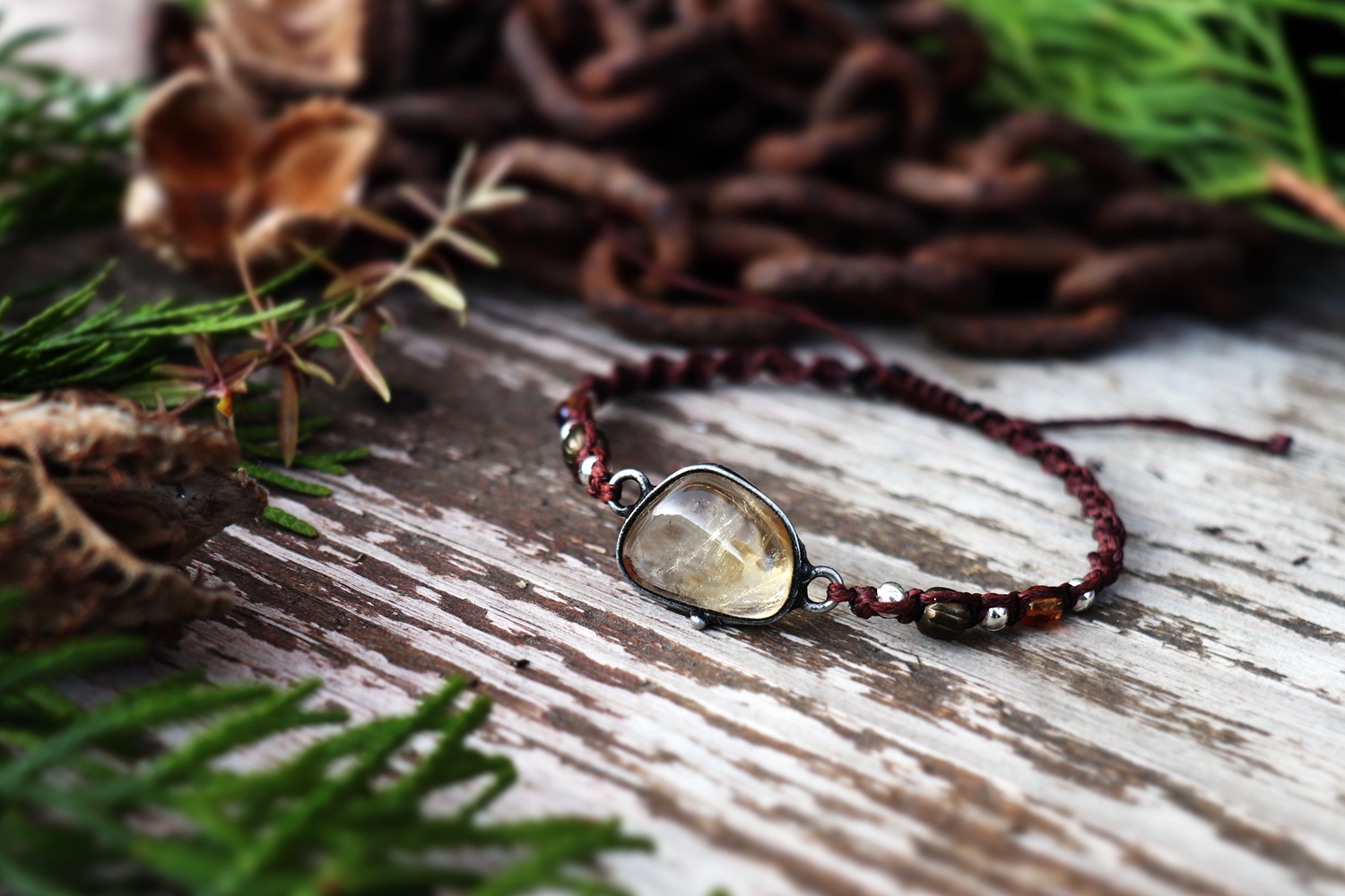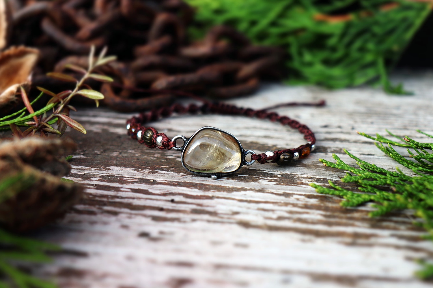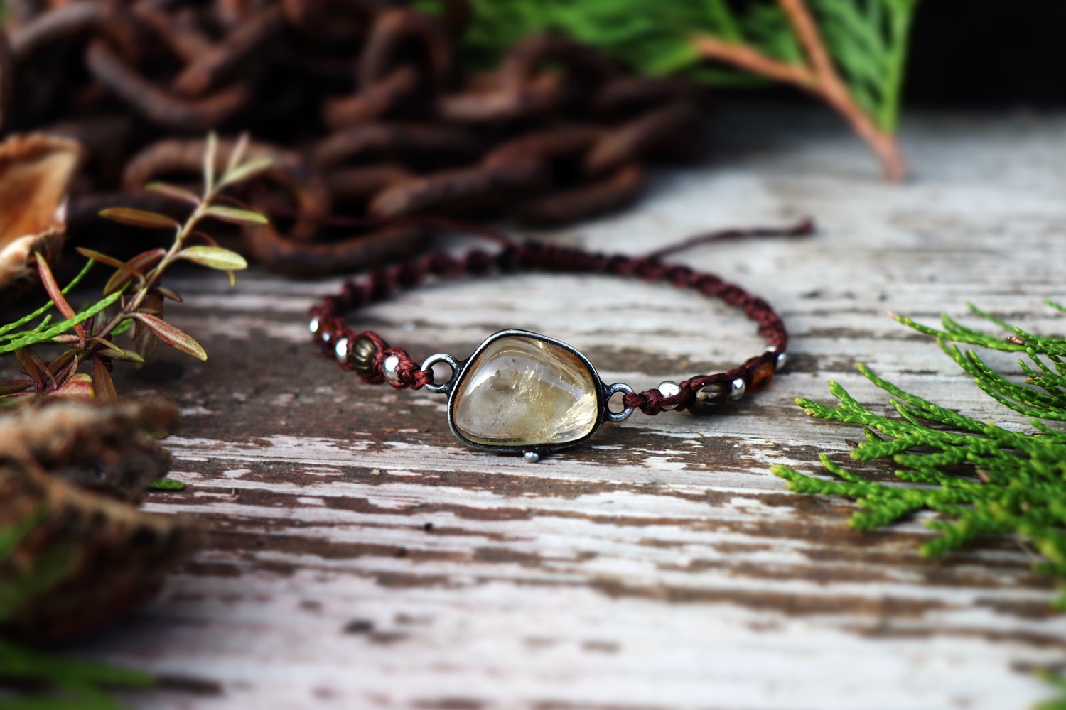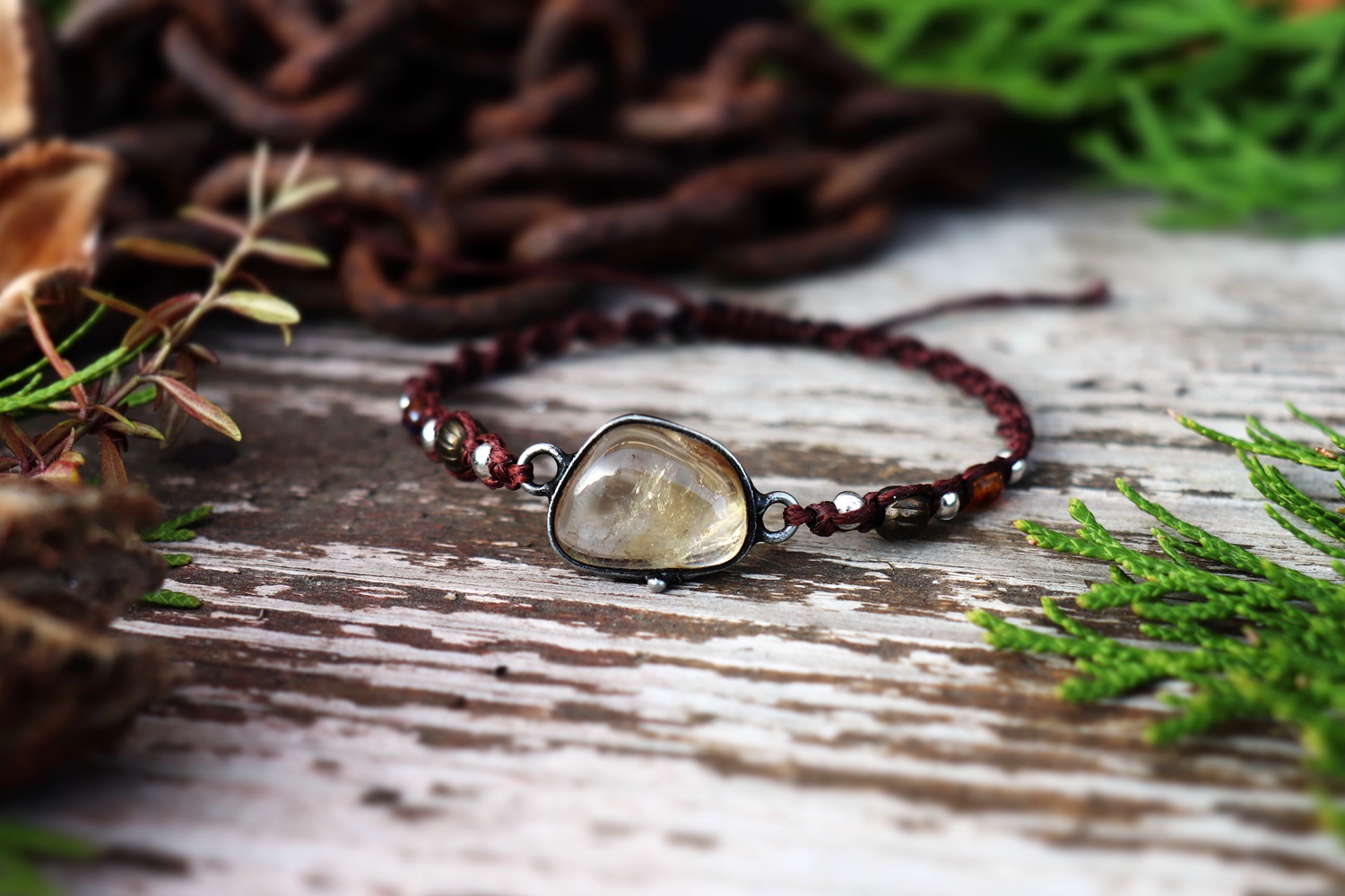 Ručně vázaný macramé náramek doplněný o cínovaný přírodní citrín, který září jemným, teplým odstínem. Citrín je kamenem prosperity, radosti a životní energie.