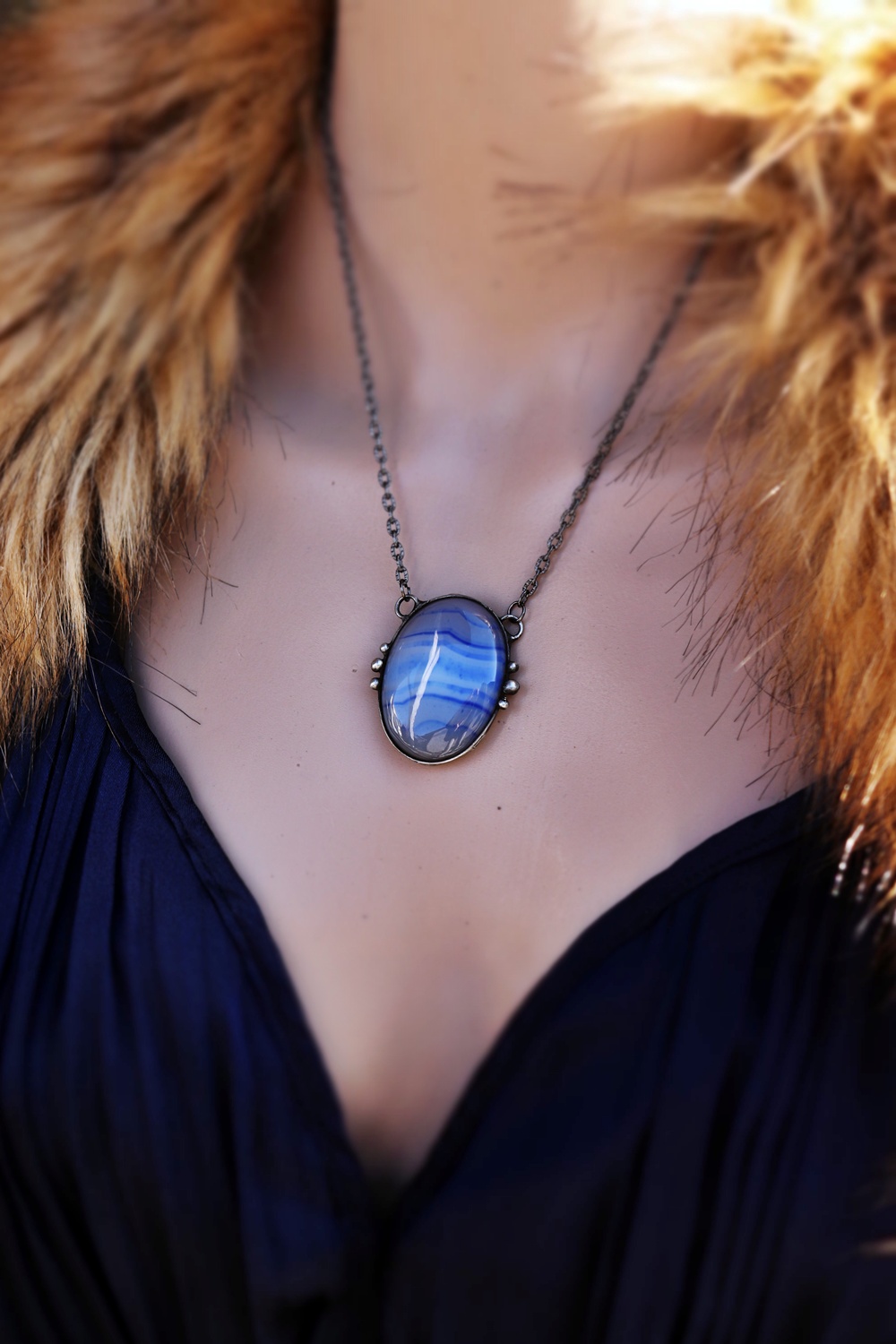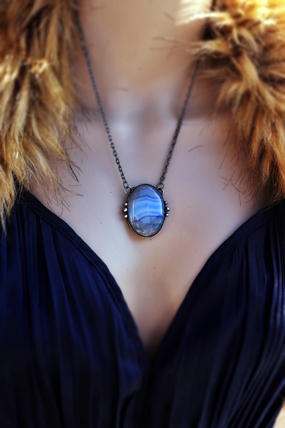 - Materiál: achát, cín s příměsí stříbra, patinovaný řetízek se zapínáním - délka 50 cm