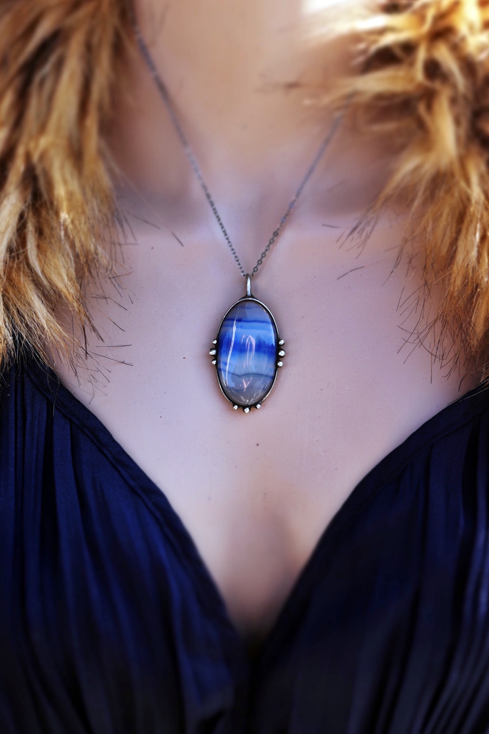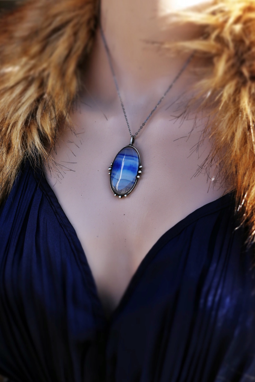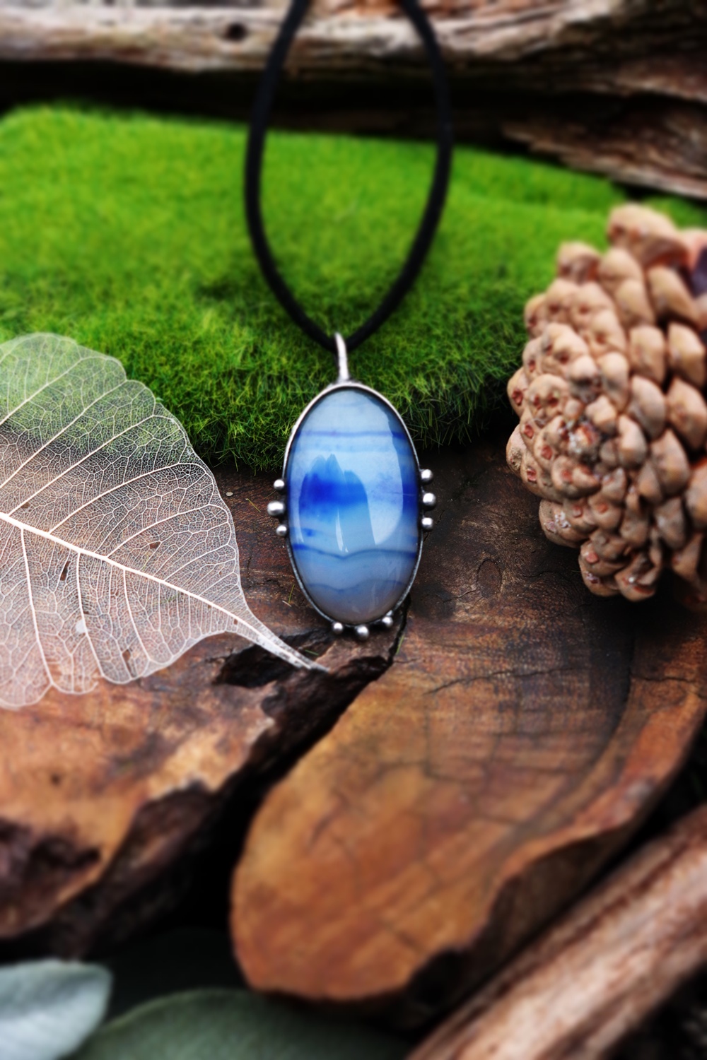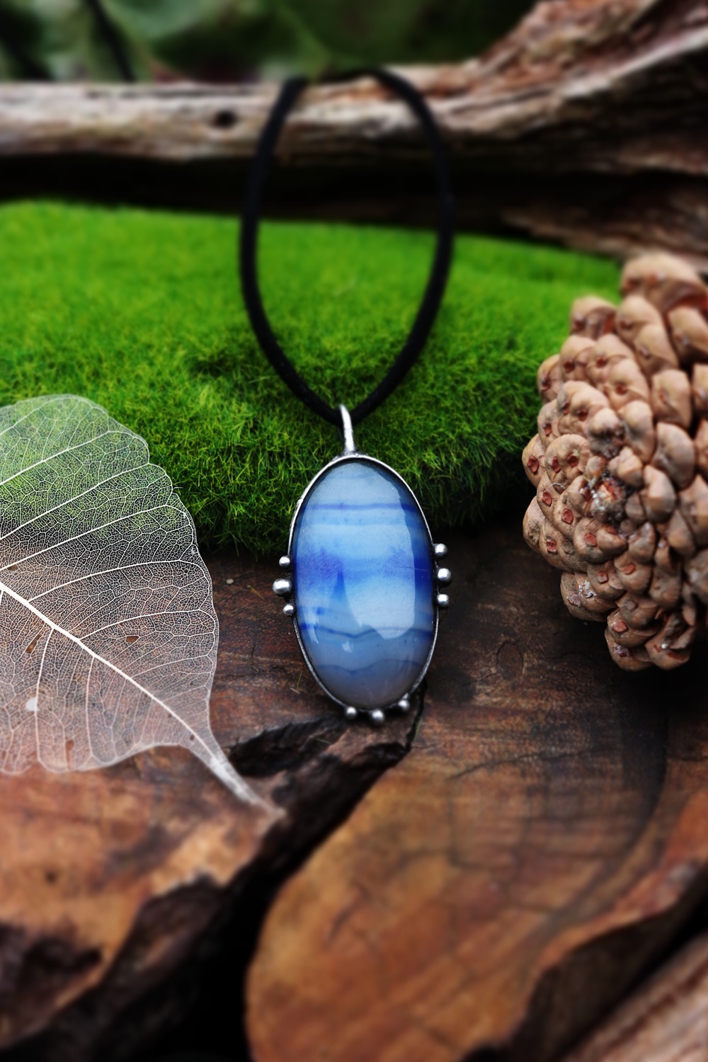 Modrý achát je jemný, harmonizační kámen, který přináší klid do myšlenek i emocí. Pomáhá zpomalit, uvolnit napětí a zlepšuje komunikaci – k sobě i k ostatním. Tento náhrdelník je ideální pro ženy, které hledají rovnováhu, klid a jemnou podporu v každodenním shonu. Doporučená znamení zvěrokruhu: Blíženci, Váhy, Vodnář, Panna Detaily: Materiál: achát, cín s příměsí stříbra, černá eko kůže na zavazování Velikost: přívěsek – 4 x 2,5 cm Barva: modrá, bílá Ruční výroba: ano, každý kus je originál Zabaleno do dárkové krabičky - připraveno k darování.