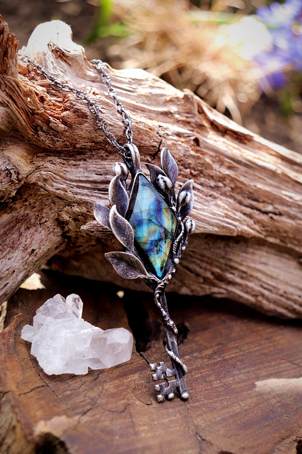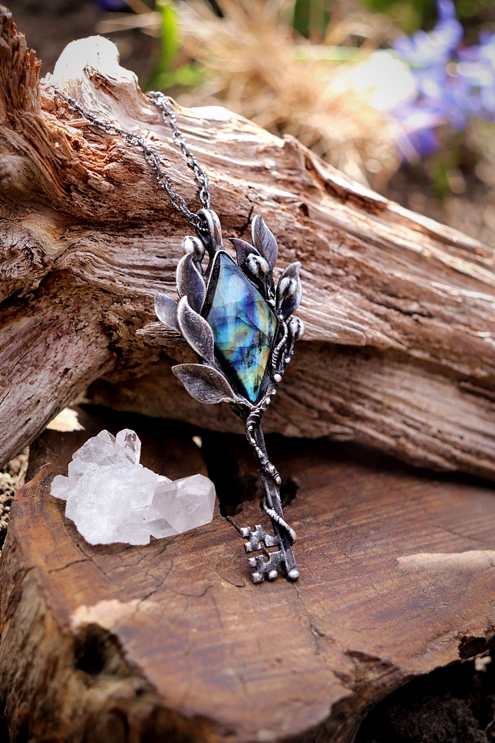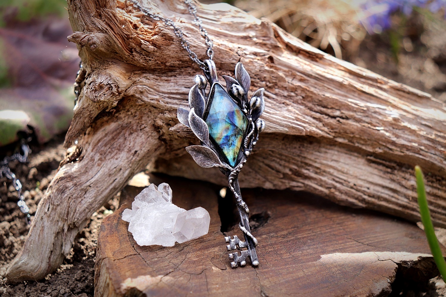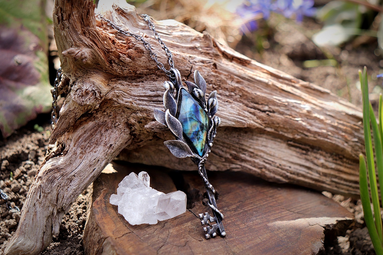 Labradorit jako kámen intuice a ochrany otevírá neviditelné cesty. Klíč symbolizuje nové začátky – i to, co teprve čeká na objevení. Detaily: Materiál: labradorit, cín s příměsí stříbra Velikost: 8 x 4 cm, zavěšen na řetízek s mechanickým zapínáním o délce 50 cm. Barva: duhové odlesky modré, zelené a zlaté Ruční výroba: ano, každý kus je originál Znamení: Ryby, Štír, Vodnář Na přání vyměním řetízek za kůži - stačí připsat do poznámky. Zabaleno v dárkové krabičce – připraveno k darování.