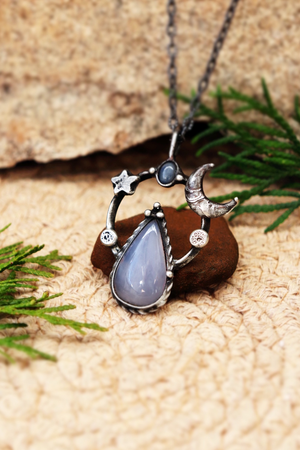 Něžný, ale silný. Chalcedon přináší klid, vnitřní vyrovnanost a podporu pro komunikaci, zatímco drobný safír chrání duši a posiluje intuici. Tento amulet je jako noční obloha v náruči měsíce – tichý, laskavý, zářivý. Detaily: Materiál: chalcedon, safír, cín s příměsí stříbra Velikost: 5 x 4 cm, délka řetízku 50 cm. Barva: modrá, bílá Ruční výroba: ano, každý kus je originál Znamení: Váhy, Ryby, Býk Zabaleno v dárkové krabičce – připraveno k darování.