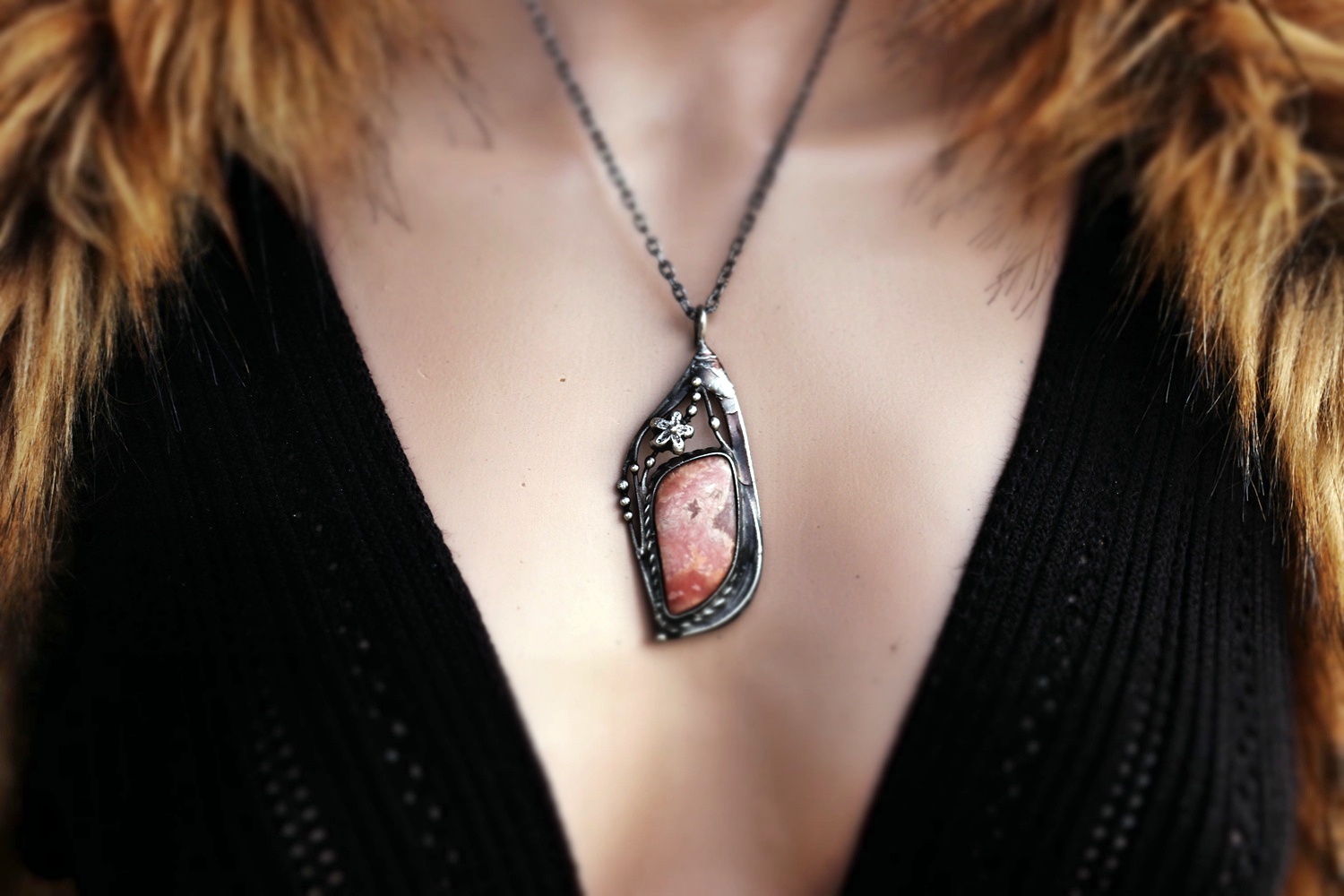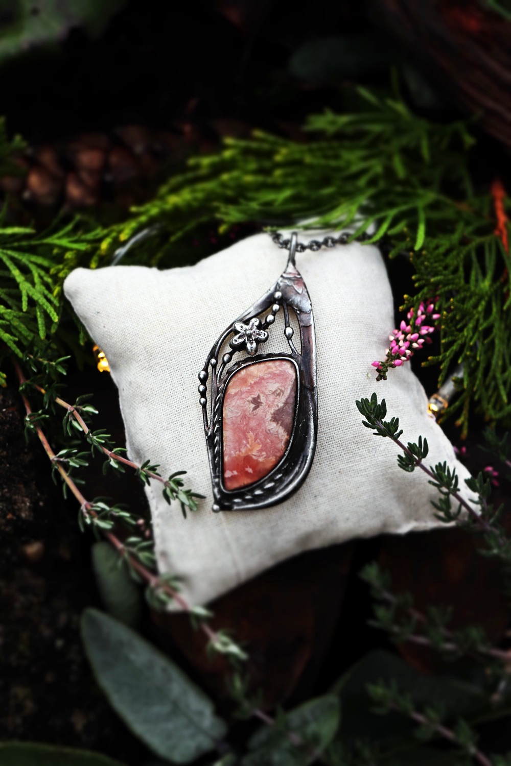 Jemný amulet lásky a radosti, který propojuje sílu rodochrozitu s energii ženského srdce. Cínovaný přívěsek s drobnou kytičkou symbolizuje něhu, sebe-lásku a návrat k vlastnímu středu. Rodochrozit pomáhá hojit stará zranění a znovu otevřít srdce radosti. Detaily: Materiál: Rodochrozit – kámen lásky, sebeúcty, odvahy cítit, cín s příměsí stříbra Velikost: 7 x 3 cm, délka řetízku 50 cm. Barva: růžová Ruční výroba: ano, každý kus je originál Znamení: Rak, Lev, Váhy, Ryby Zabaleno v dárkové krabičce – připraveno k darování.