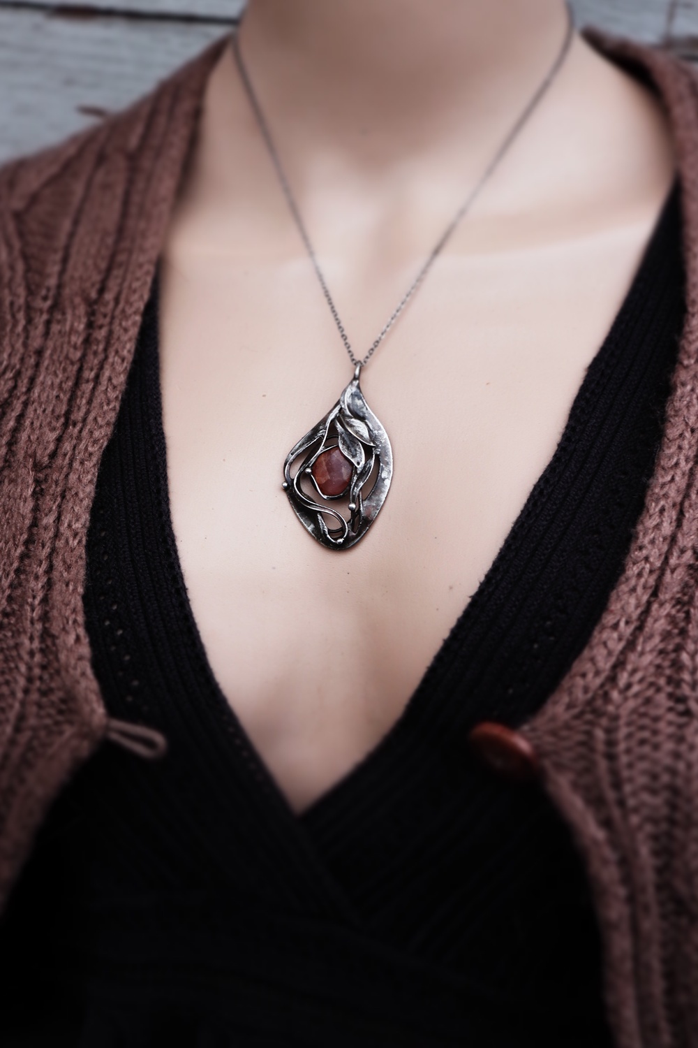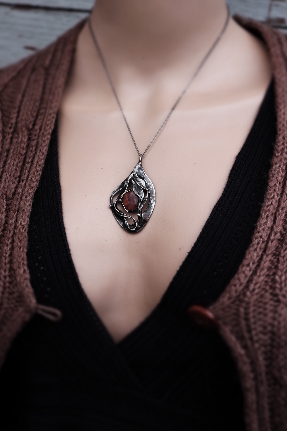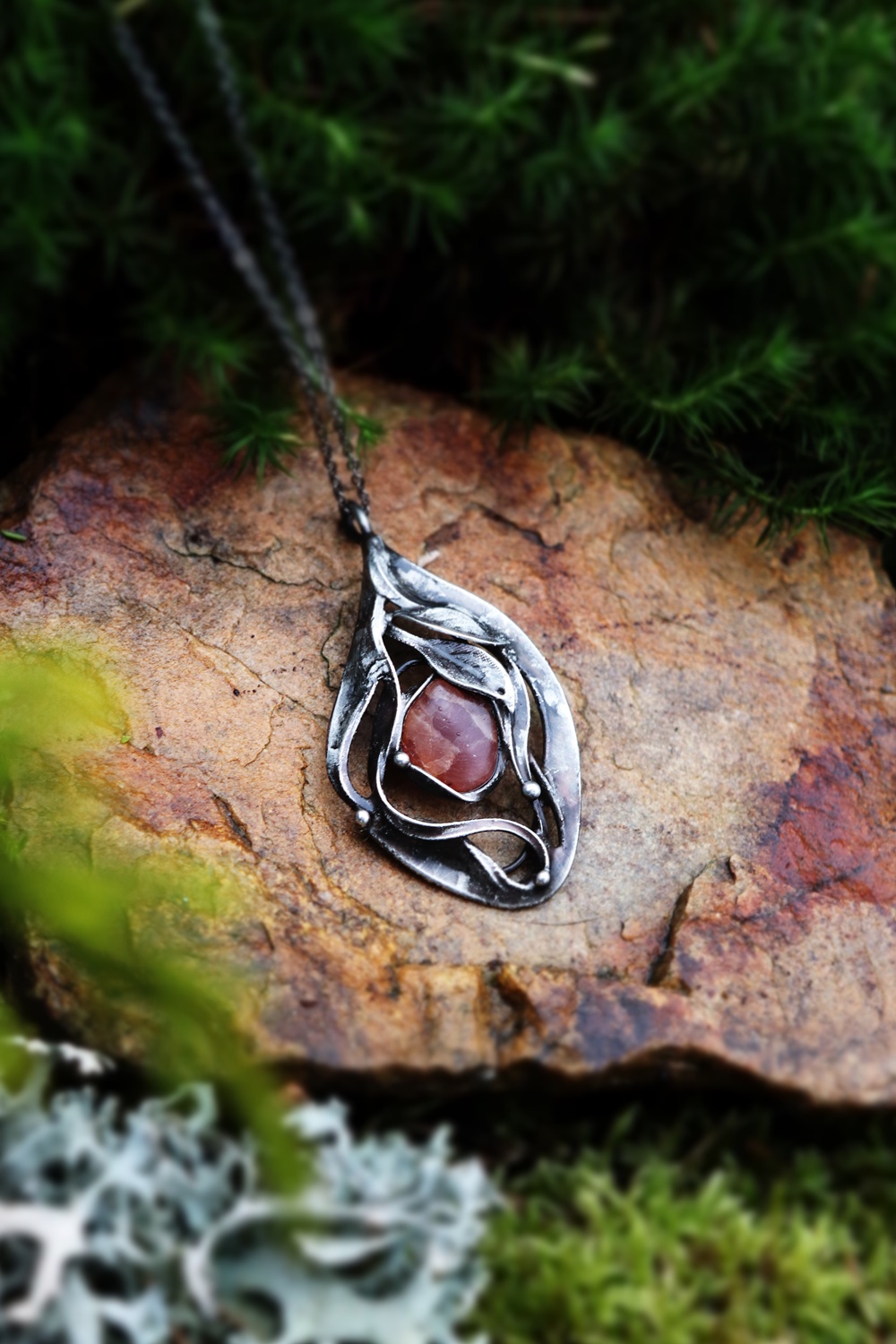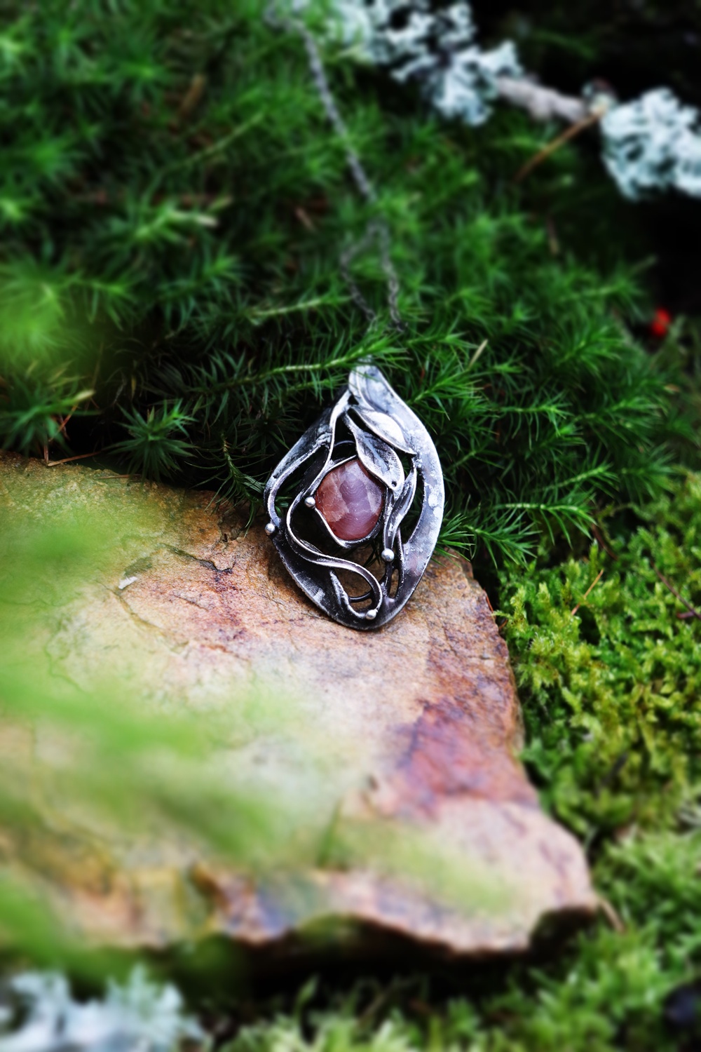 - Materiál: rodochrozit, cín s příměsí stříbra. patina,