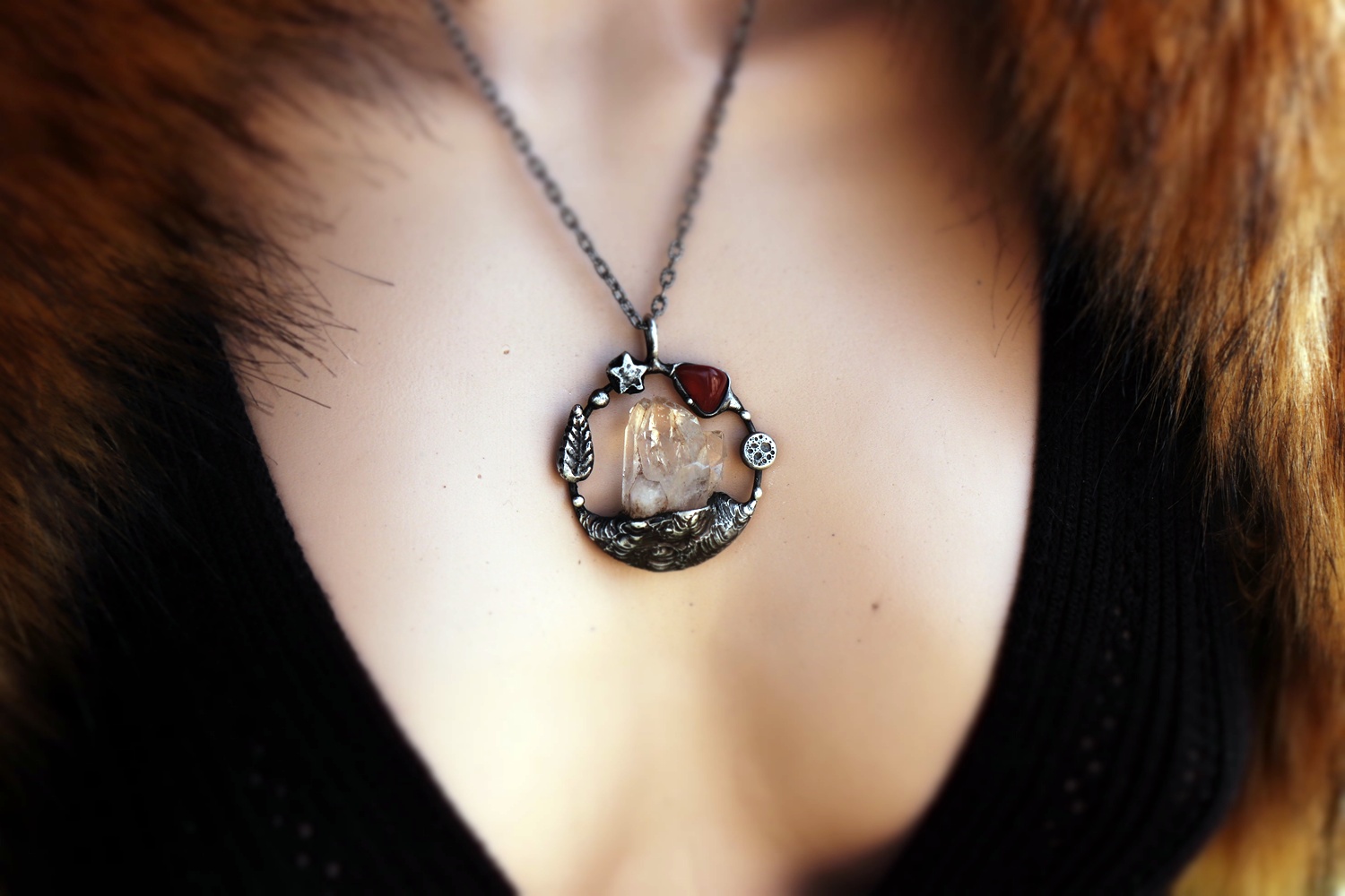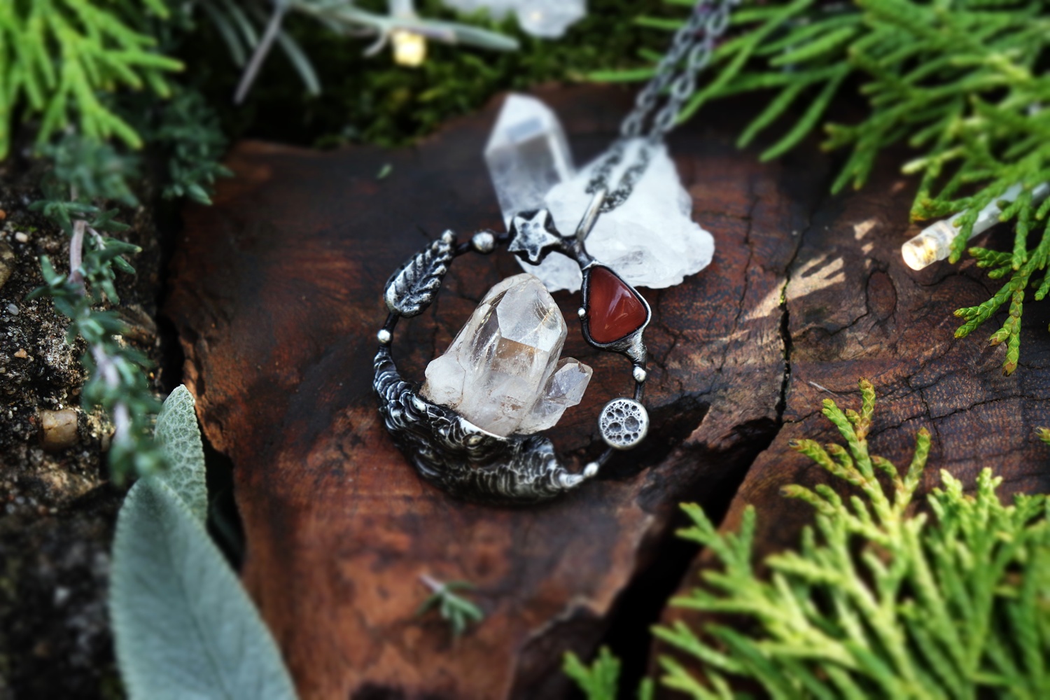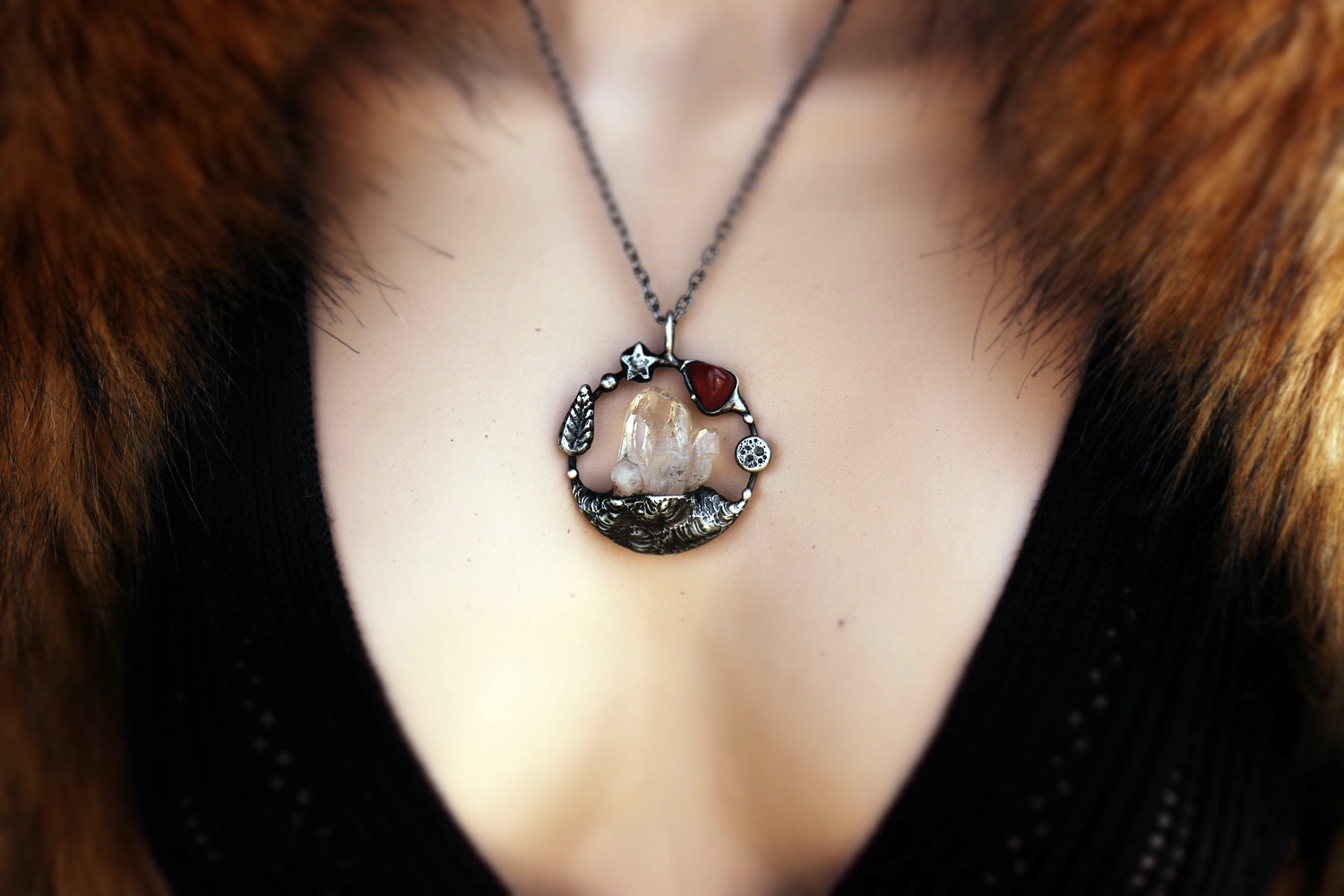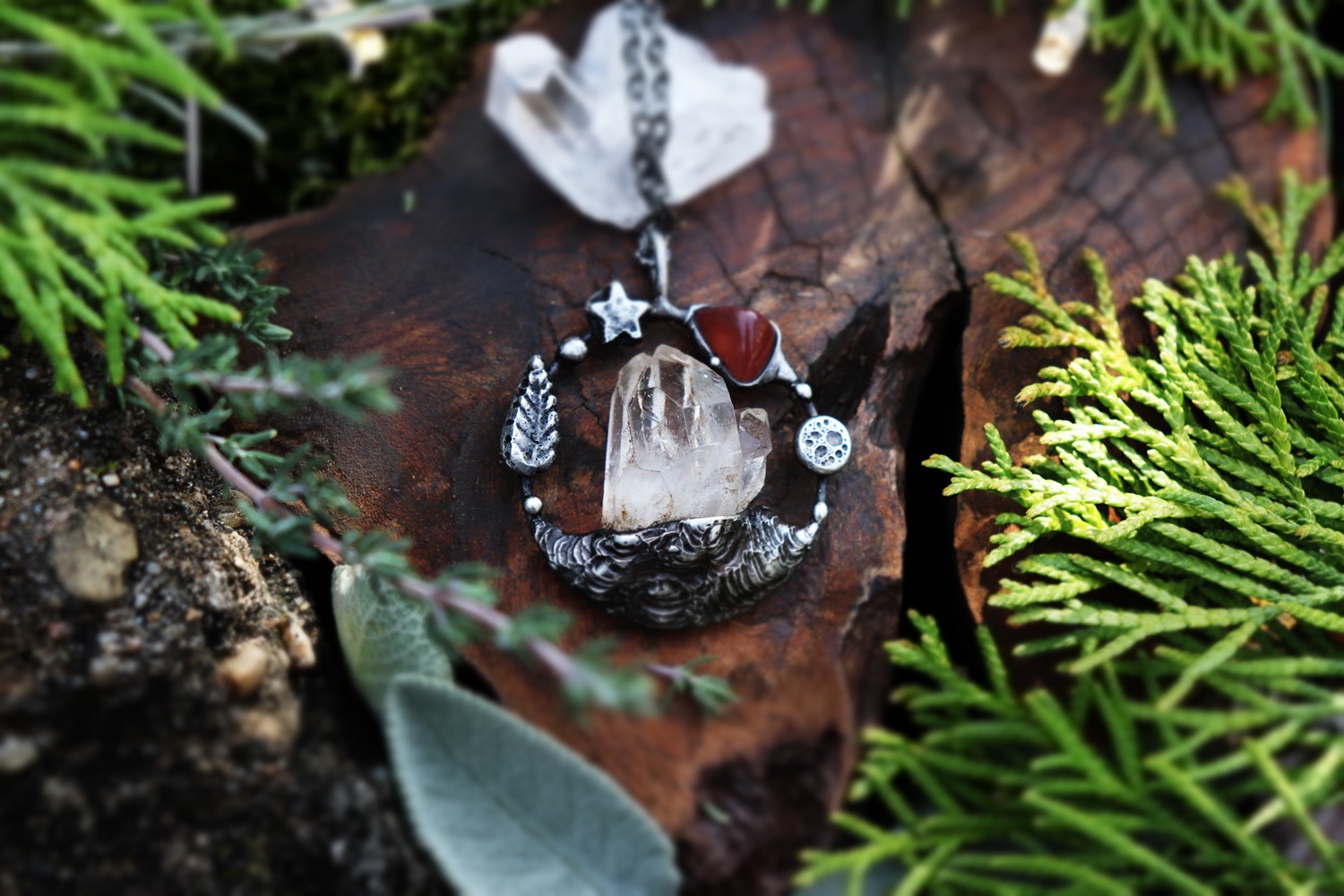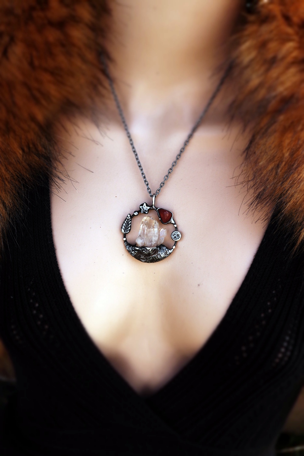 Křišťál a rodochrozit – spojení čistoty a něžnosti v jednom amuletu. Náhrdelník ,, Dech hvězd" je symbolem světla, které nikdy neuhasne. Křišťál čistí a harmonizuje energii, zatímco drobný rodochrozit otevírá srdce lásce a laskavosti. Cínovaný šperk v kruhu působí jako ochranné kouzlo, které tě obklopí klidem a vílí lehkostí. Detaily: Materiál: křišťál, rodochrozit, vlastnoručně vyrobené cínové odlitky (hvězdička, lísteček) cín s příměsí stříbra Velikost: 5 x 4cm Barva: čirá, červená Ruční výroba: ano, každý kus je originál Zabaleno v dárkové krabičce – připraveno k darování.