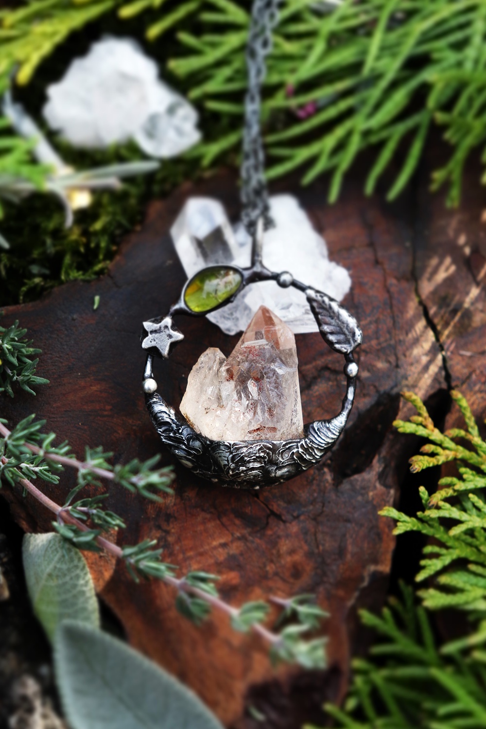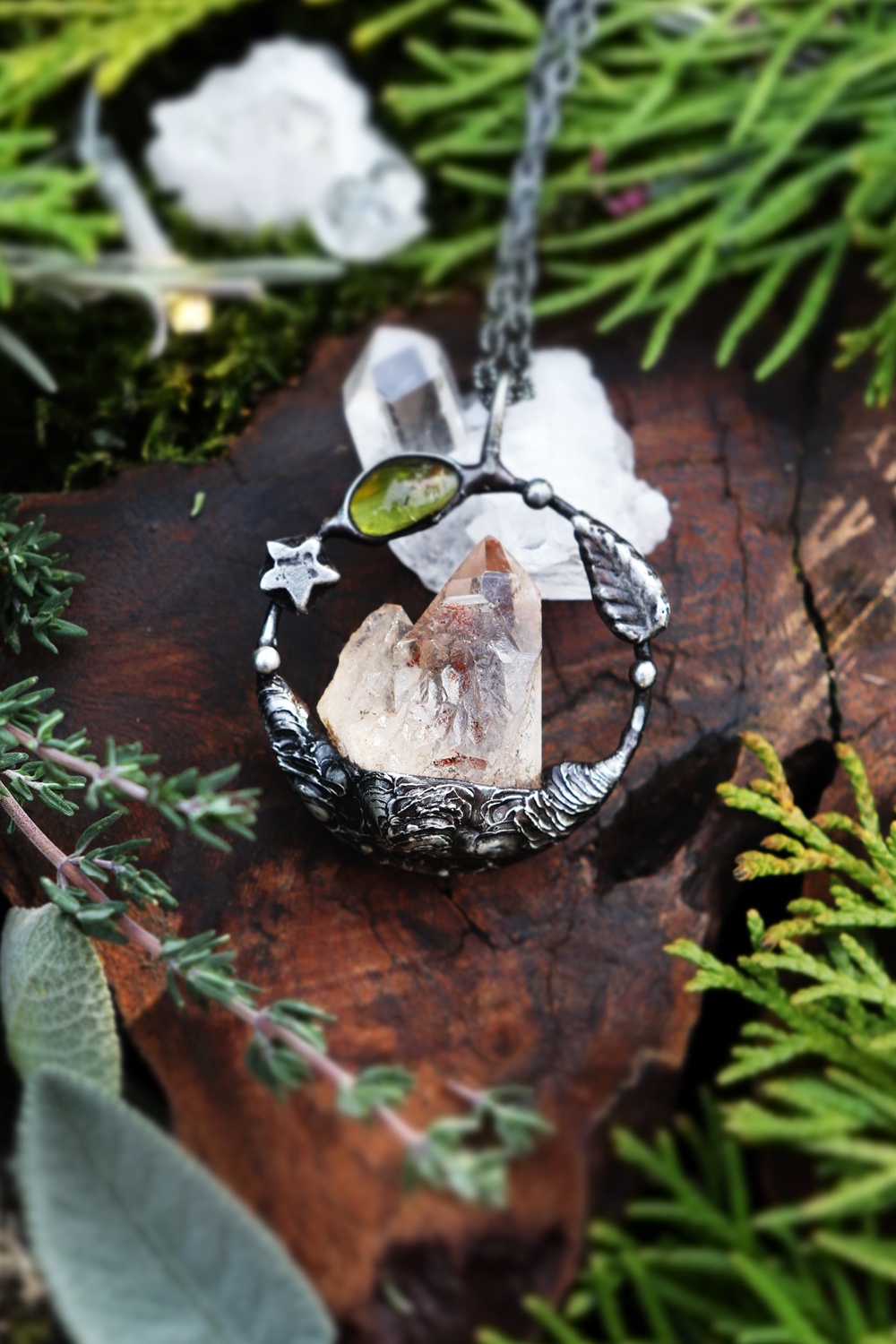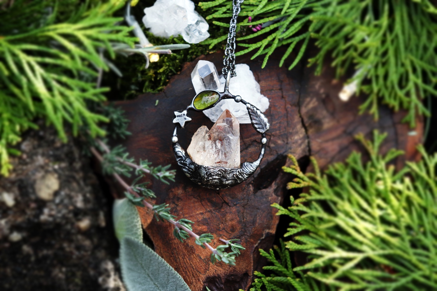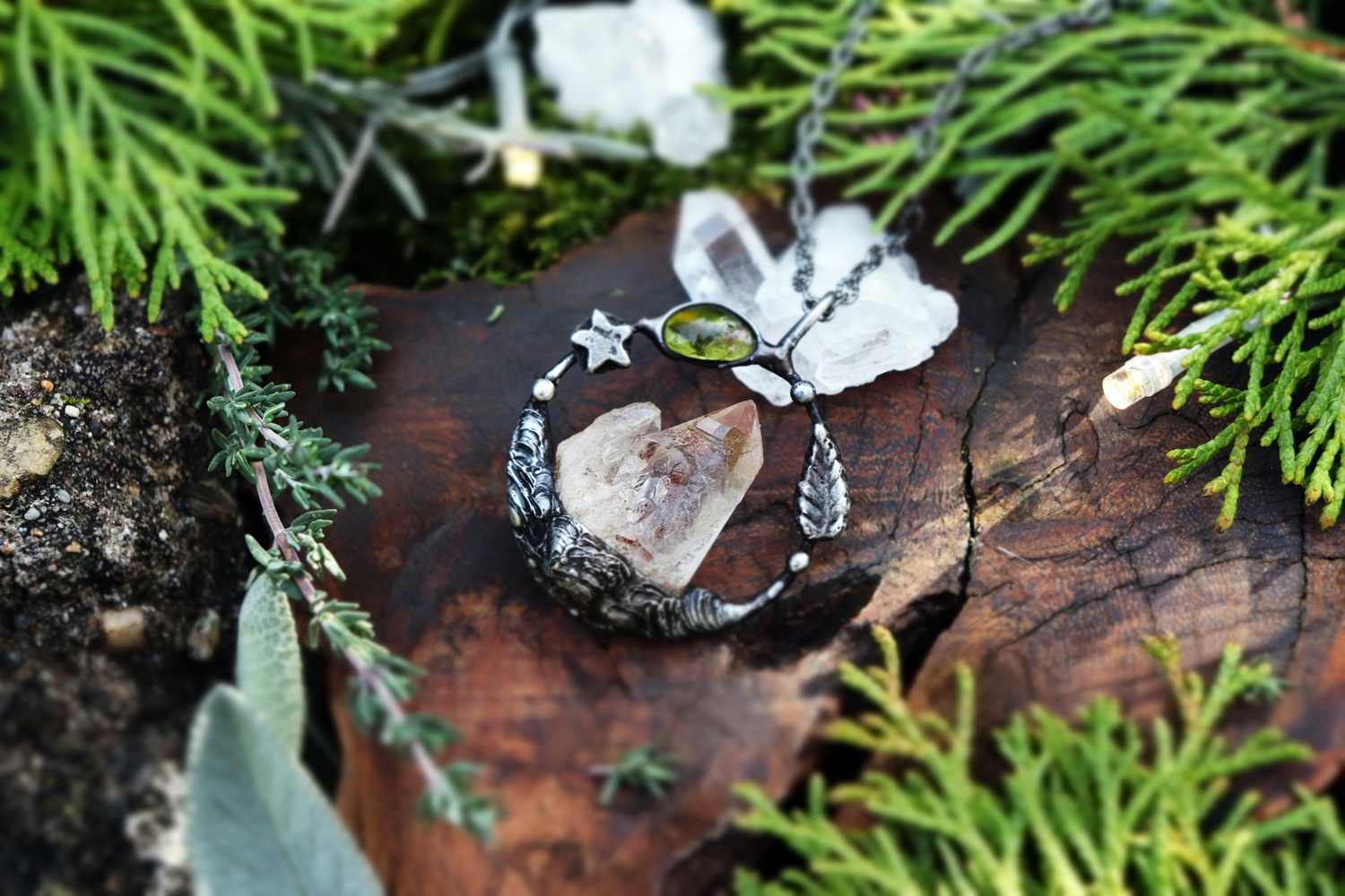 Spojení křišťálu a olivínu – očista, klid a propojení se Zemí. Šperk ,, Brána světla" je symbolem harmonie mezi nebem a zemí. Křišťál pročišťuje energii a přináší jasno, zatímco olivín uzemňuje a otevírá cestu k hojnosti. Spolu tvoří mocný amulet, který chrání a podporuje tvé vnitřní světlo. Detaily: Materiál: křišťál, olivín, vlastnoručně vyrobené cínové odlitky (hvězdička, lísteček) cín s příměsí stříbra Velikost: 5 x 4cm Barva: čirá, zelená Ruční výroba: ano, každý kus je originál Zabaleno v dárkové krabičce – připraveno k darování.