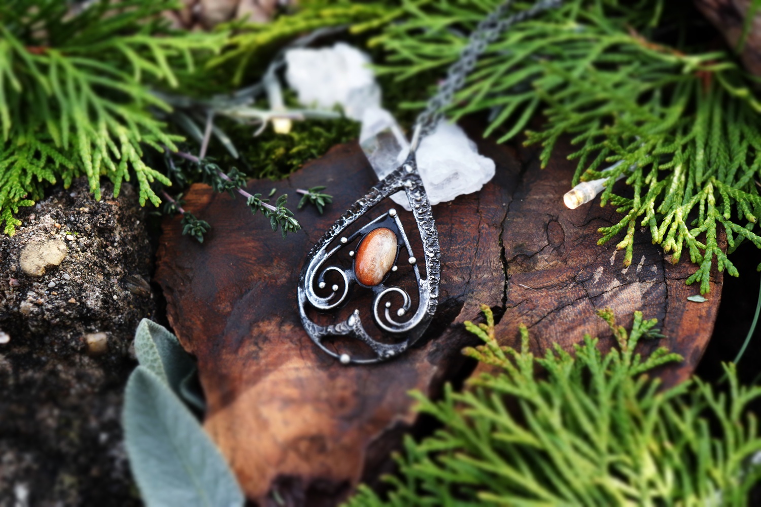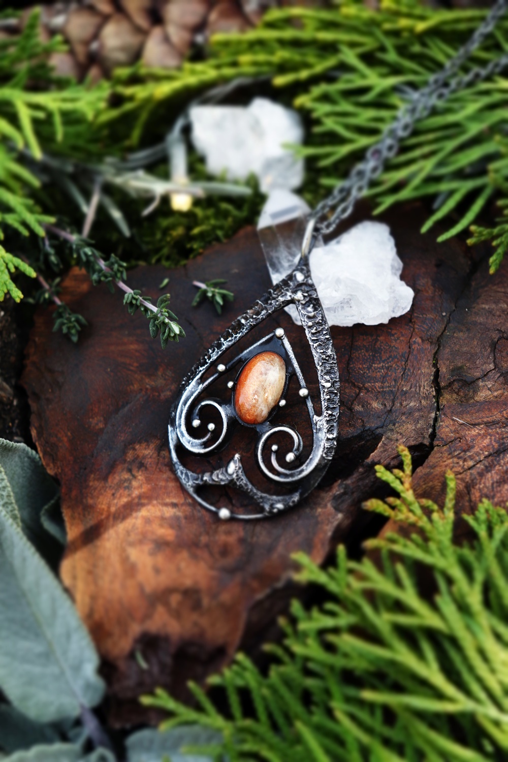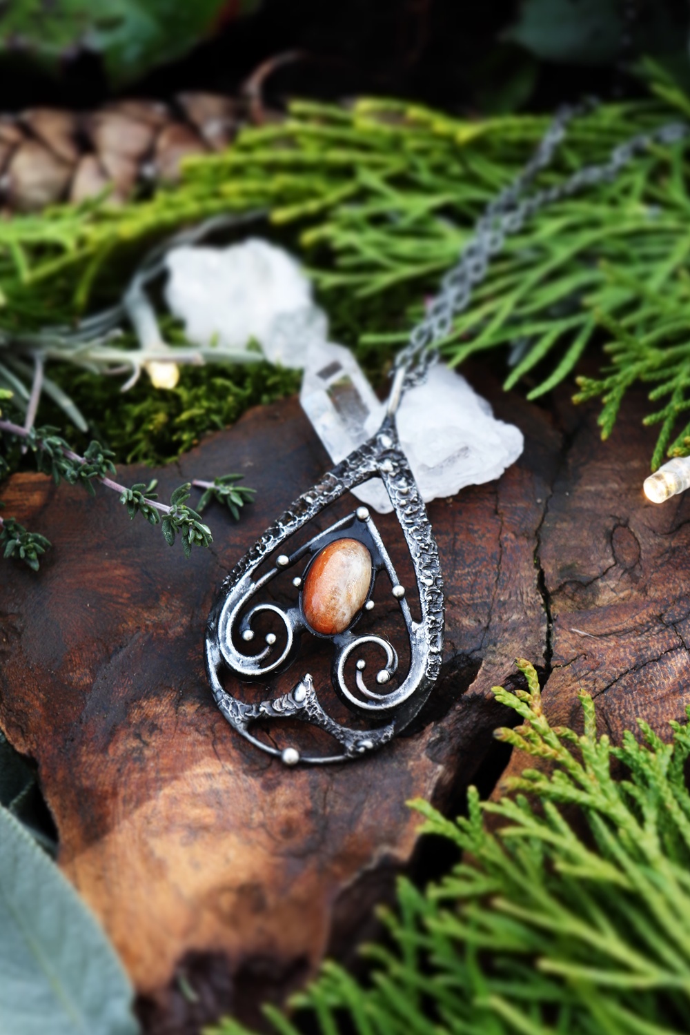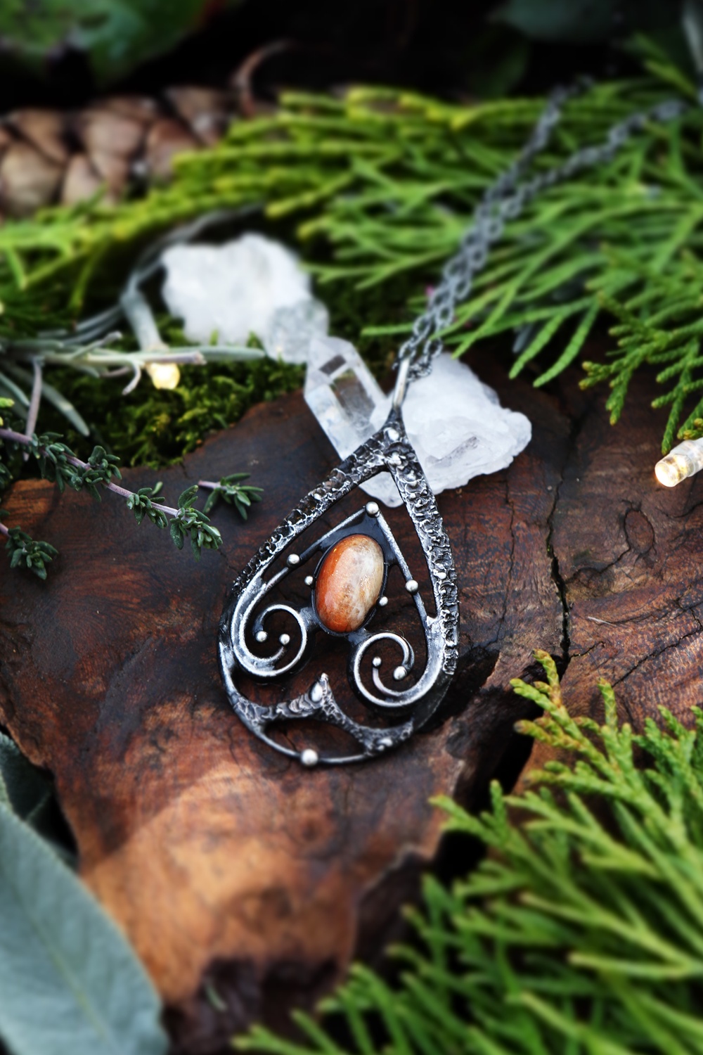 ,,Jitřní kouzlo" v sobě má teplo a energii nového dne. Sluneční kámen probouzí vnitřní světlo, odvahu a sebedůvěru. Ručně cínovaný šperk se spirálami symbolizuje proud života, který plyne lehce, když nás vede srdce