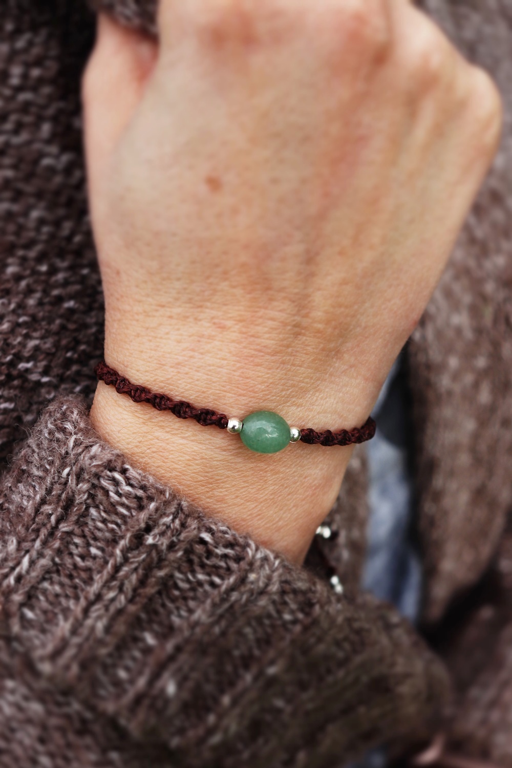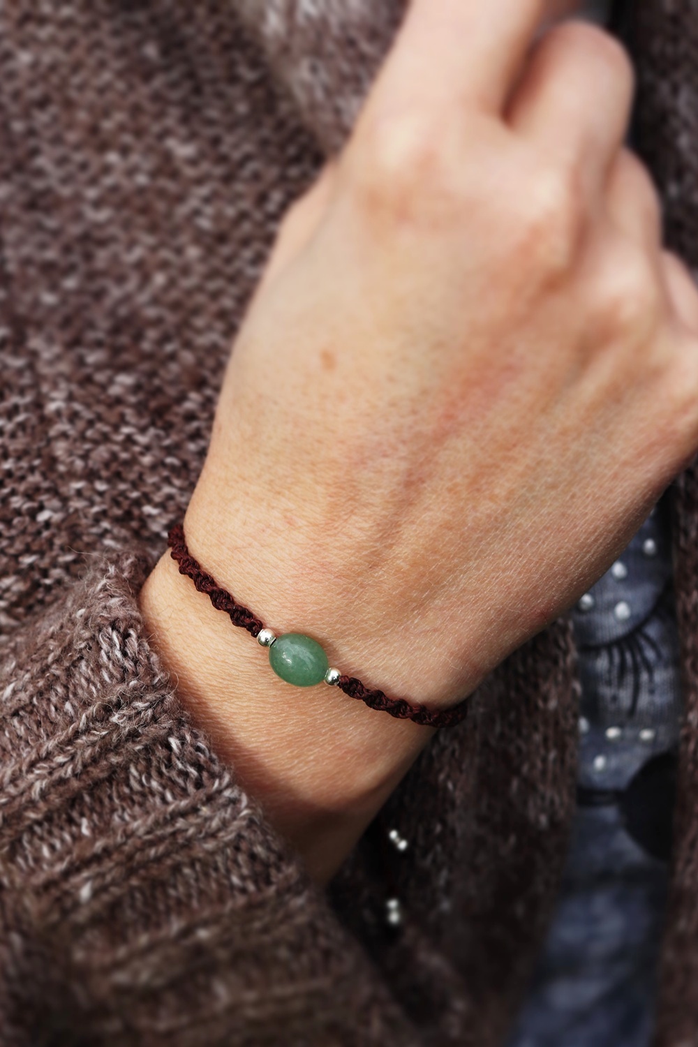 Doplněn voskovanou šňůrkou tmavě hnědé barvy, zapletenou