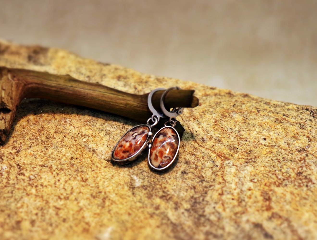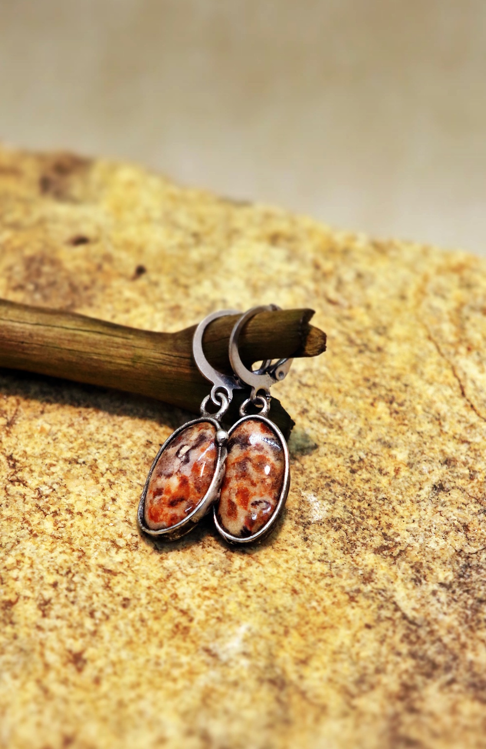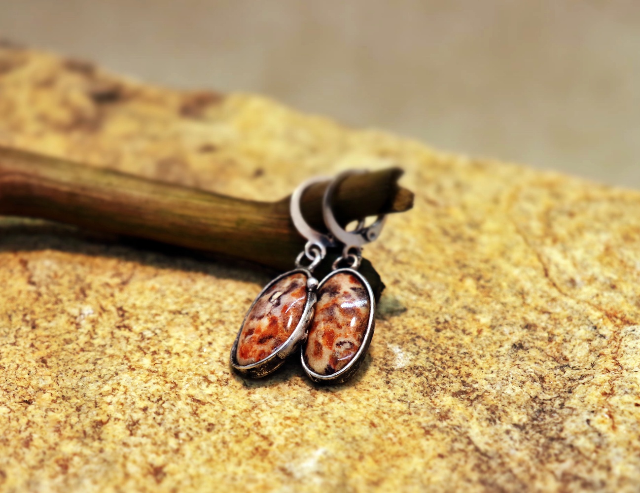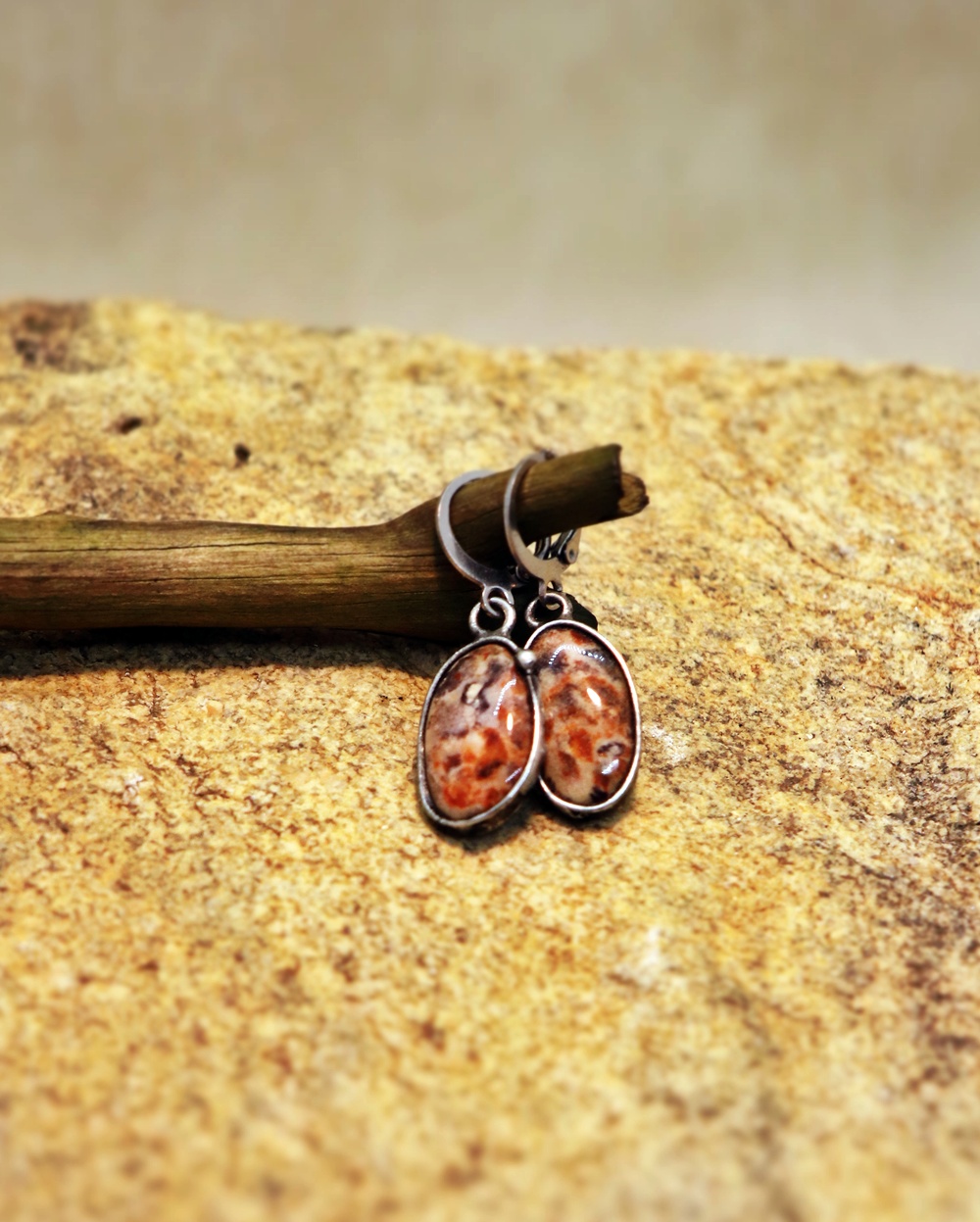 Elegantní ručně vyrobené náušnice ve výrazném teple zbarveném jaspisu asteroid. Každý ovál má jemnou kresbu, která z nich dělá originál, a cín dodává náušnicím rustikální a řemeslný charakter.