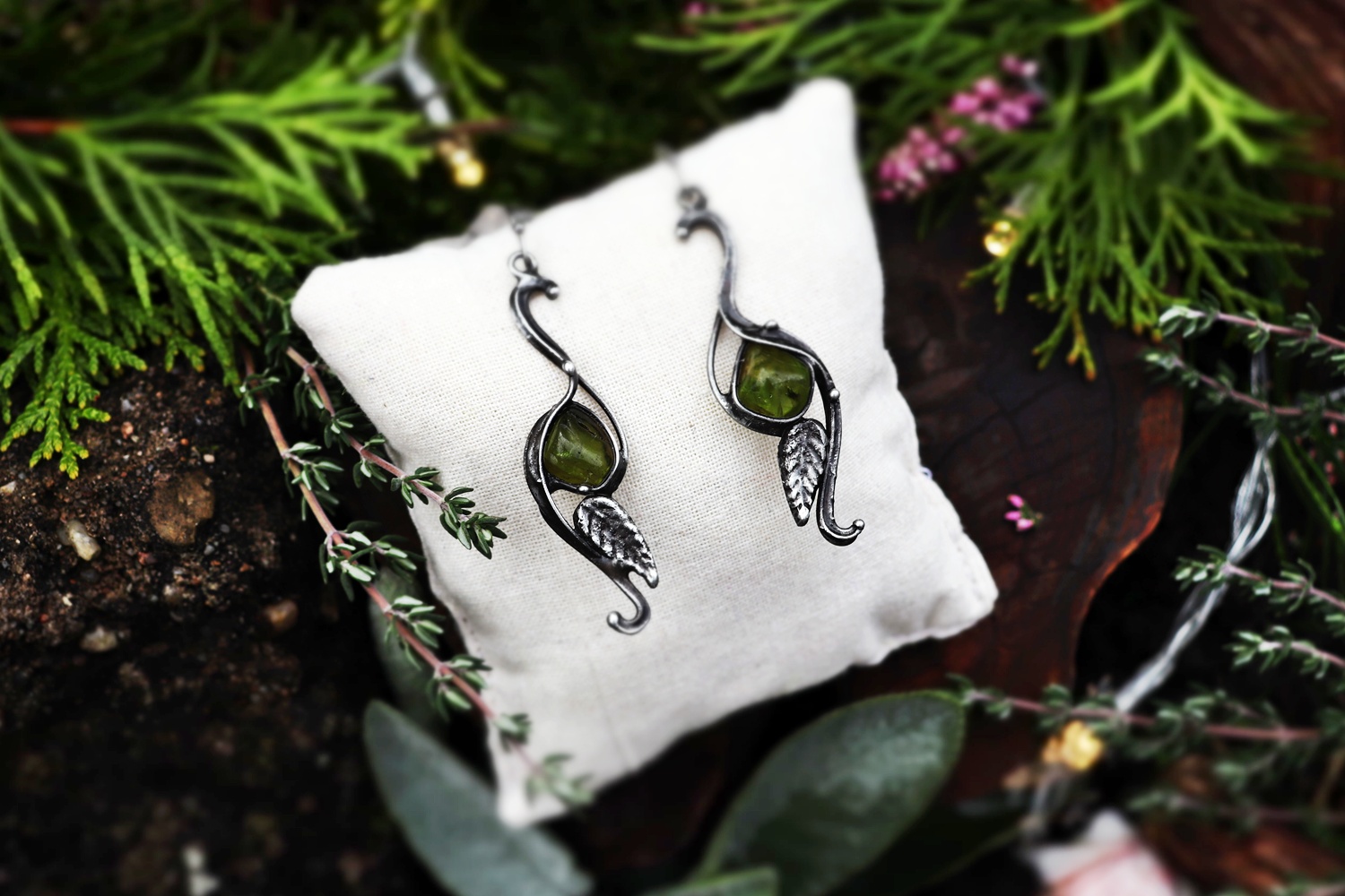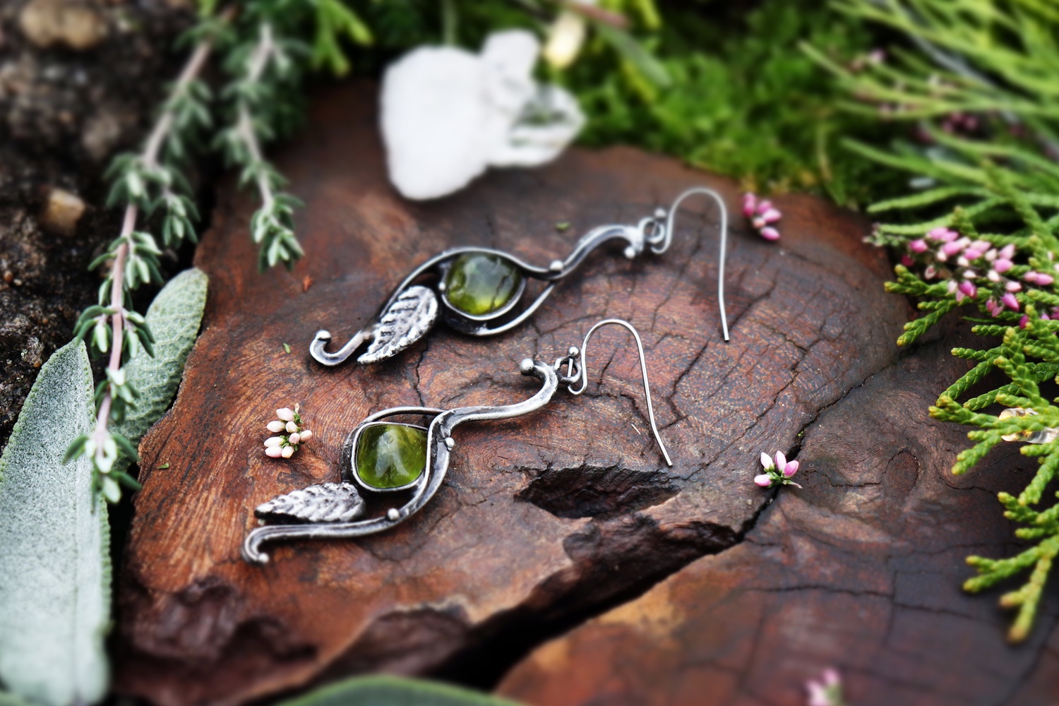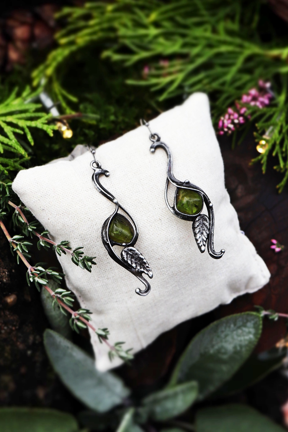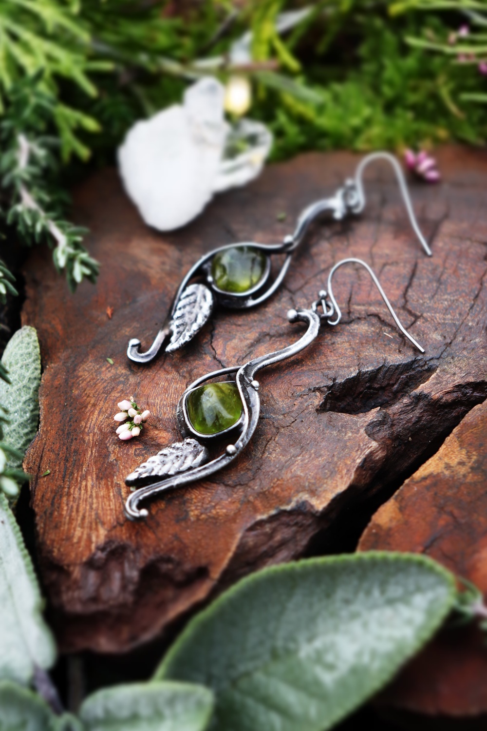 Lehké, něžné a plné životní energie. Olivín je kamenem radosti, regenerace a očisty. Přináší svěžest, pomáhá uvolnit staré zážitky a znovu věřit v sílu nových začátků. Tyto cínované náušnice jsou jako listy, které šeptají příběhy lesa.