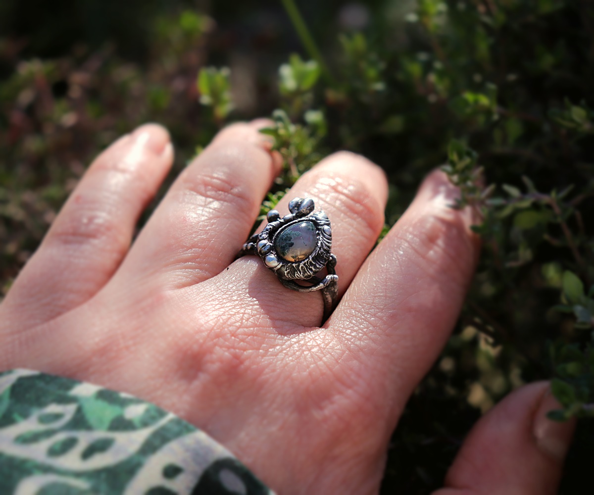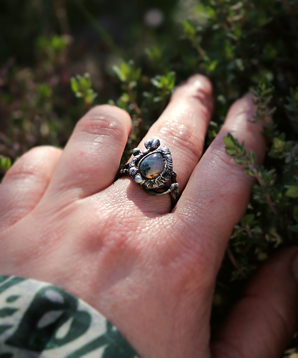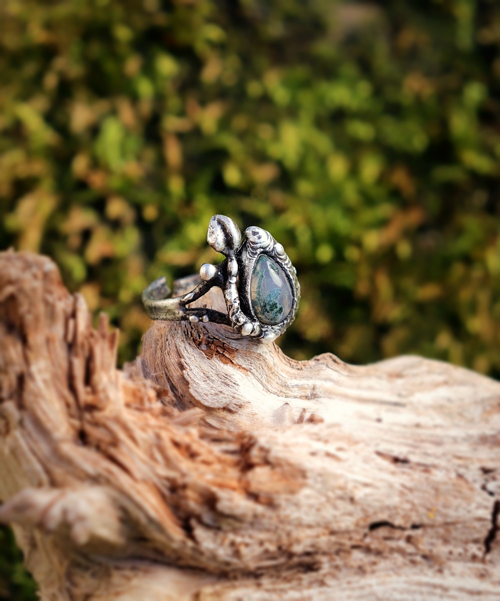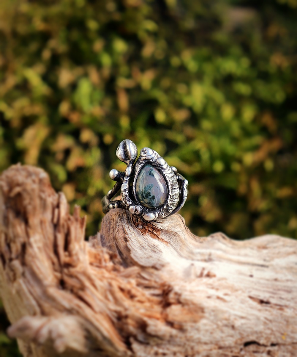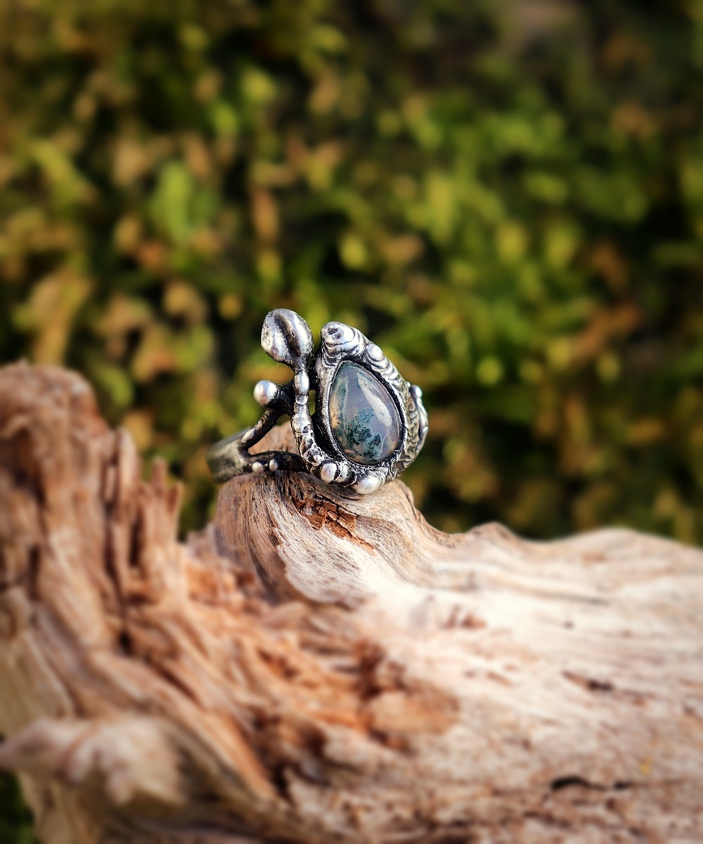 - Materiál: mechový achát, cín s příměsí stříbra