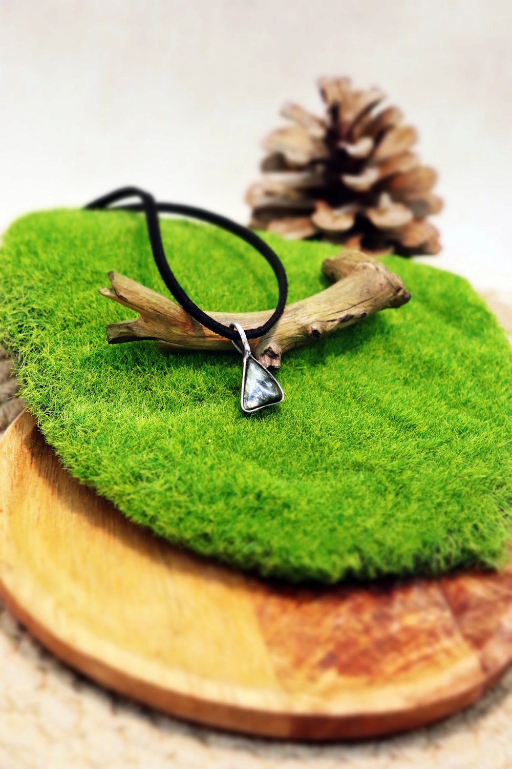 2,2 cm x 1 cm, zavěšen na černou plochou eko kůži na zavazování o délce 80 cm.