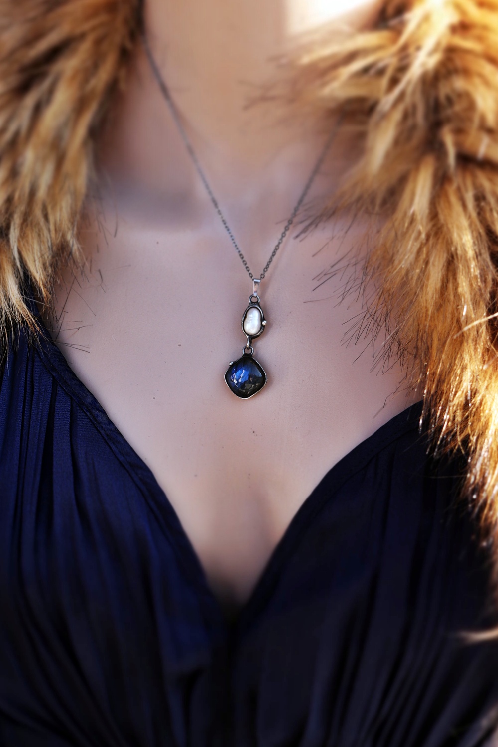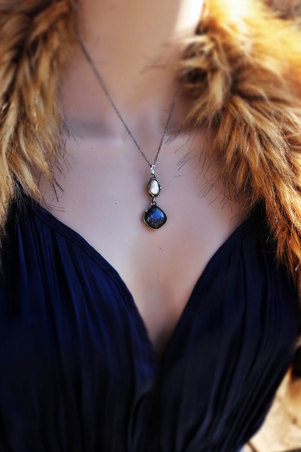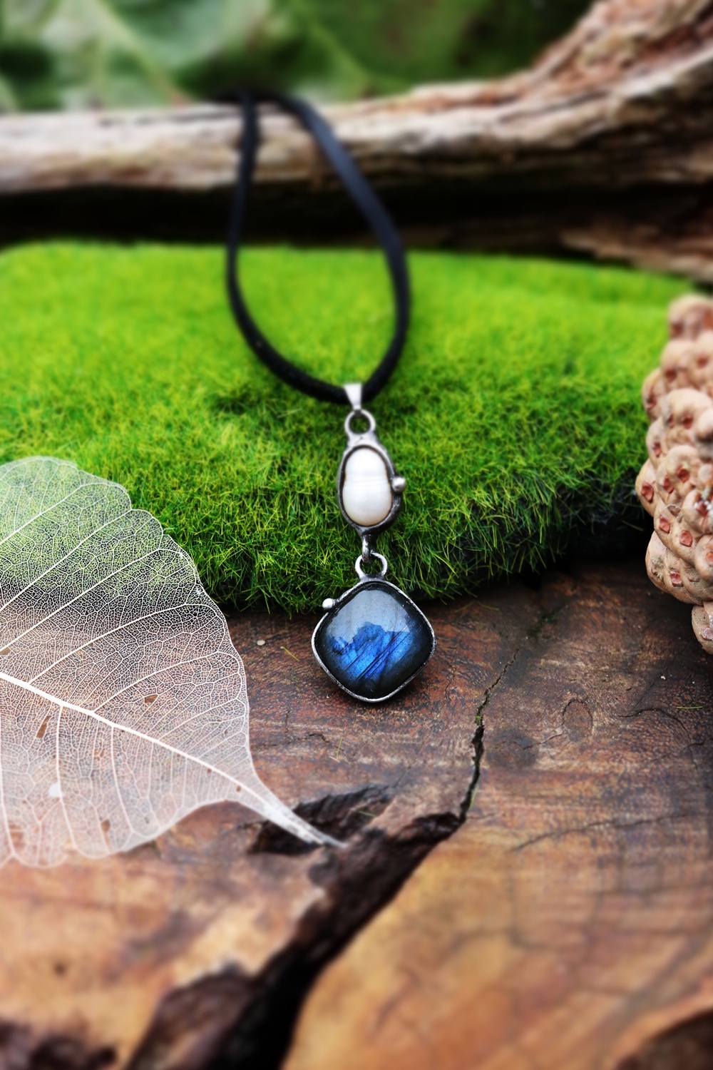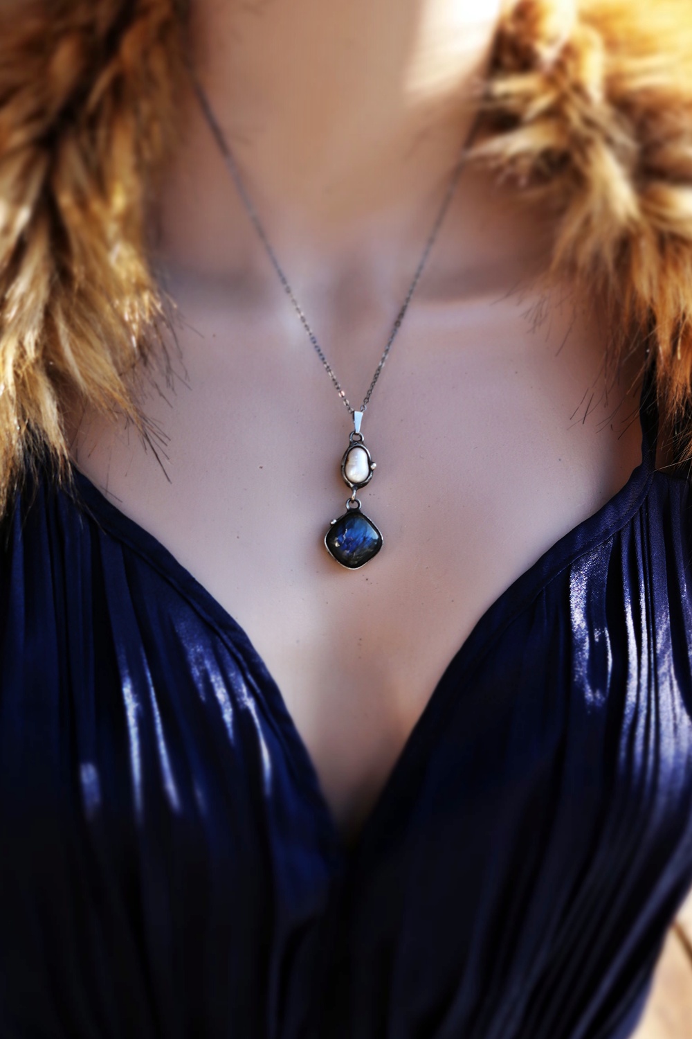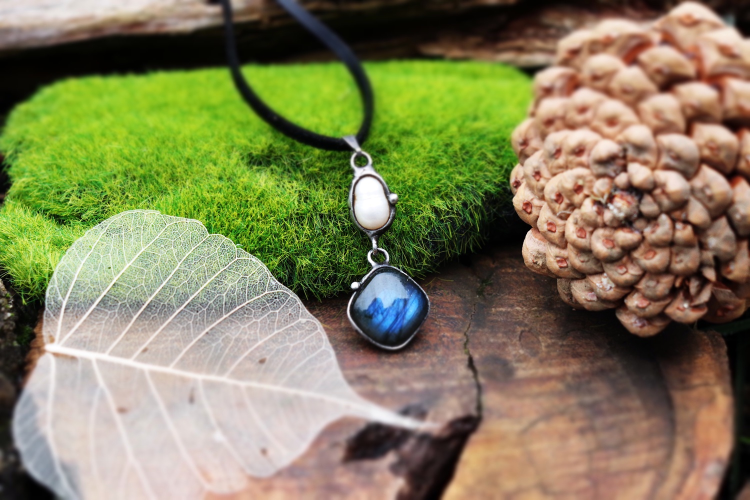 Spojení labradoritu a říční perly vytváří harmonii mezi intuicí a jemností.