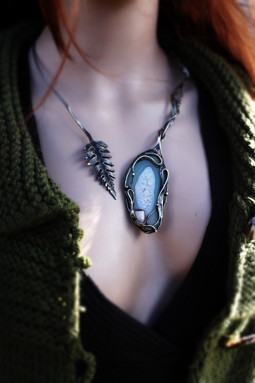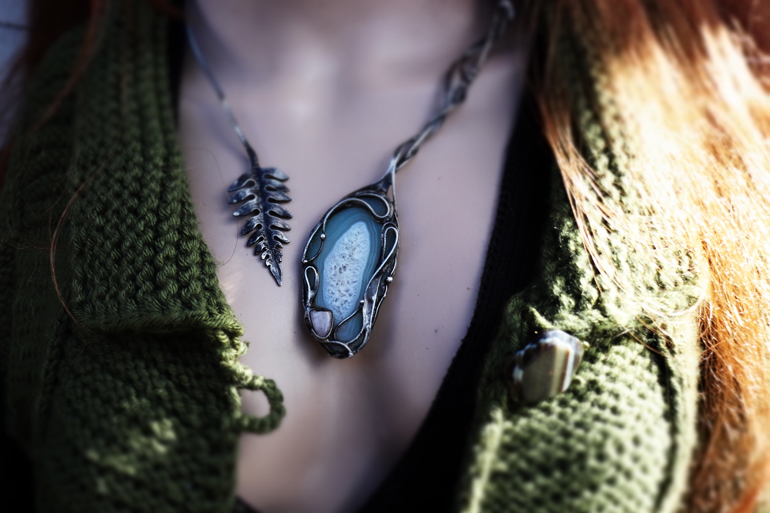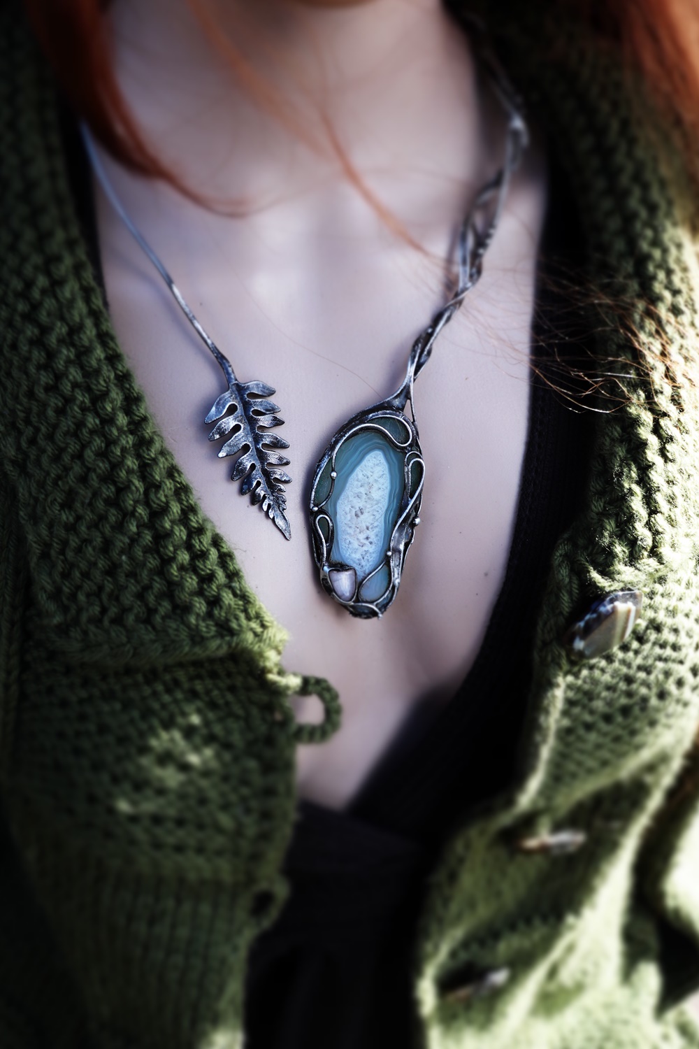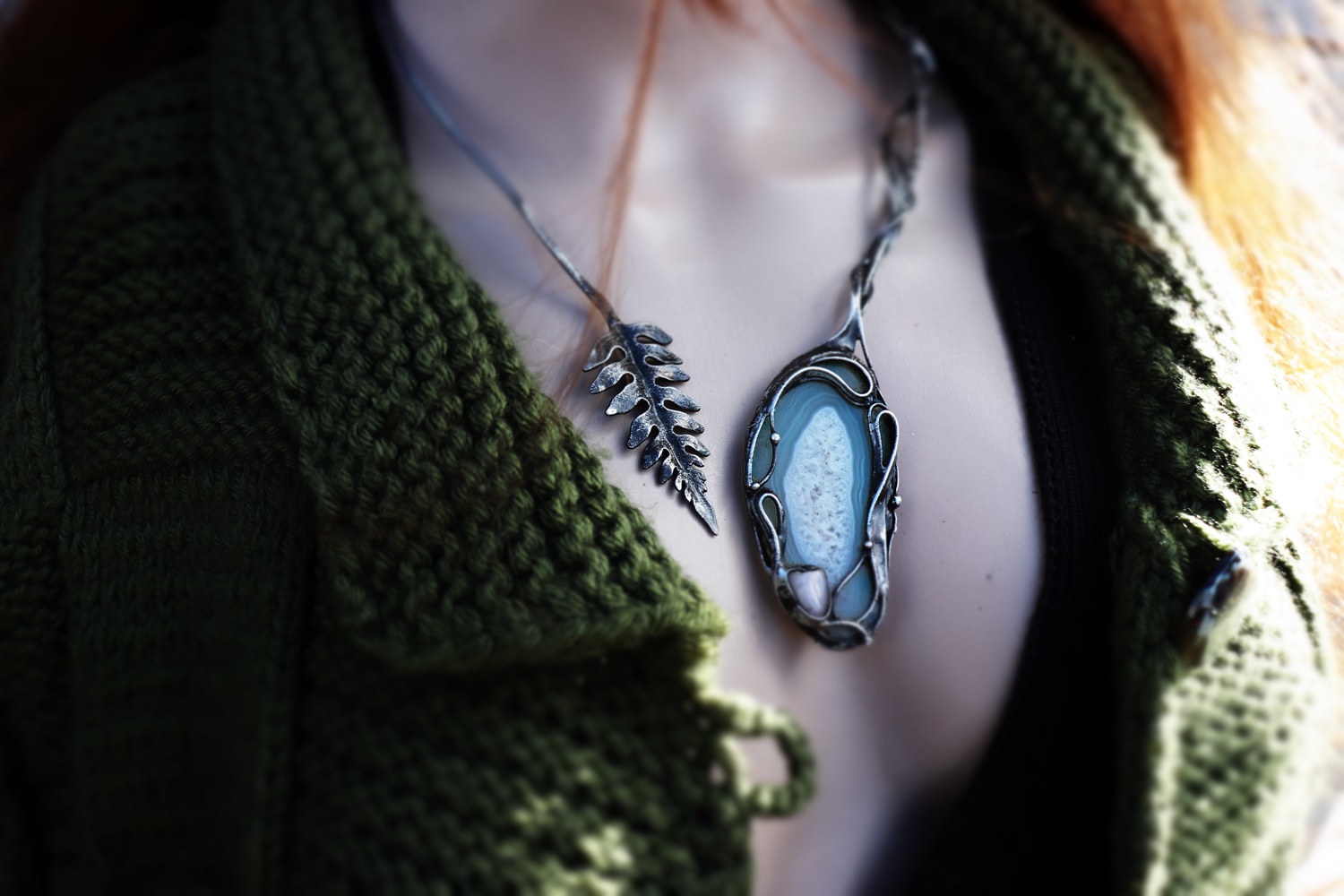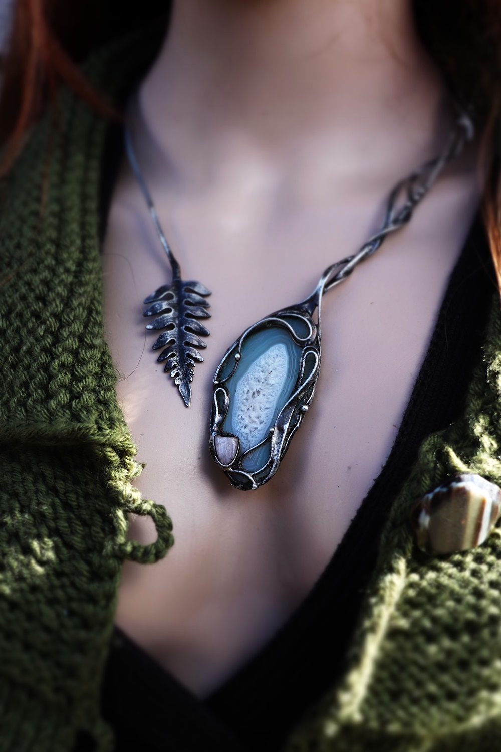 Modrý achát je jemný, harmonizační kámen, který přináší klid do myšlenek i emocí. Pomáhá zpomalit, uvolnit napětí a zlepšuje komunikaci – k sobě i k ostatním. Tento náhrdelník je ideální pro ženy, které hledají rovnováhu, klid a jemnou podporu v každodenním shonu. Doporučená znamení zvěrokruhu: Blíženci, Váhy, Vodnář, Panna Detaily: Materiál: achát, cín s příměsí stříbra, černá eko kůže na zavazování Velikost: přívěsek – 4 x 2,5 cm Barva: modrá, bílá Ruční výroba: ano, každý kus je originál Zabaleno do dárkové krabičky - připraveno k darování.