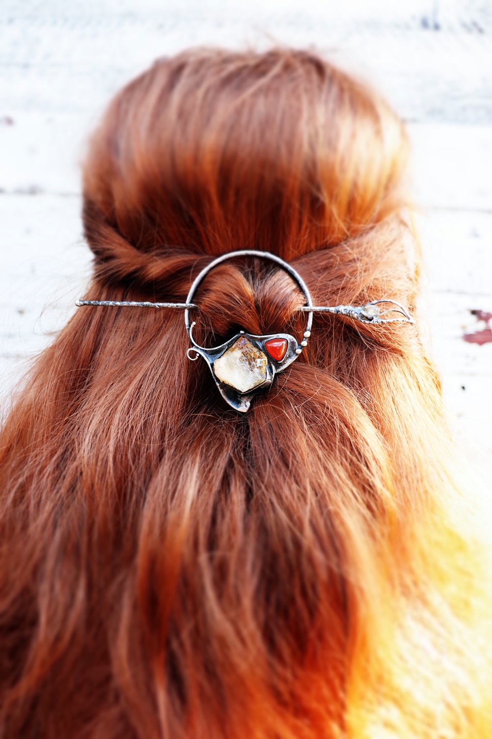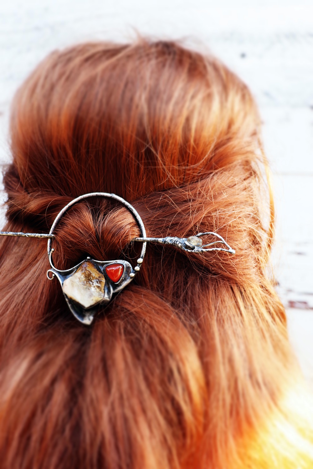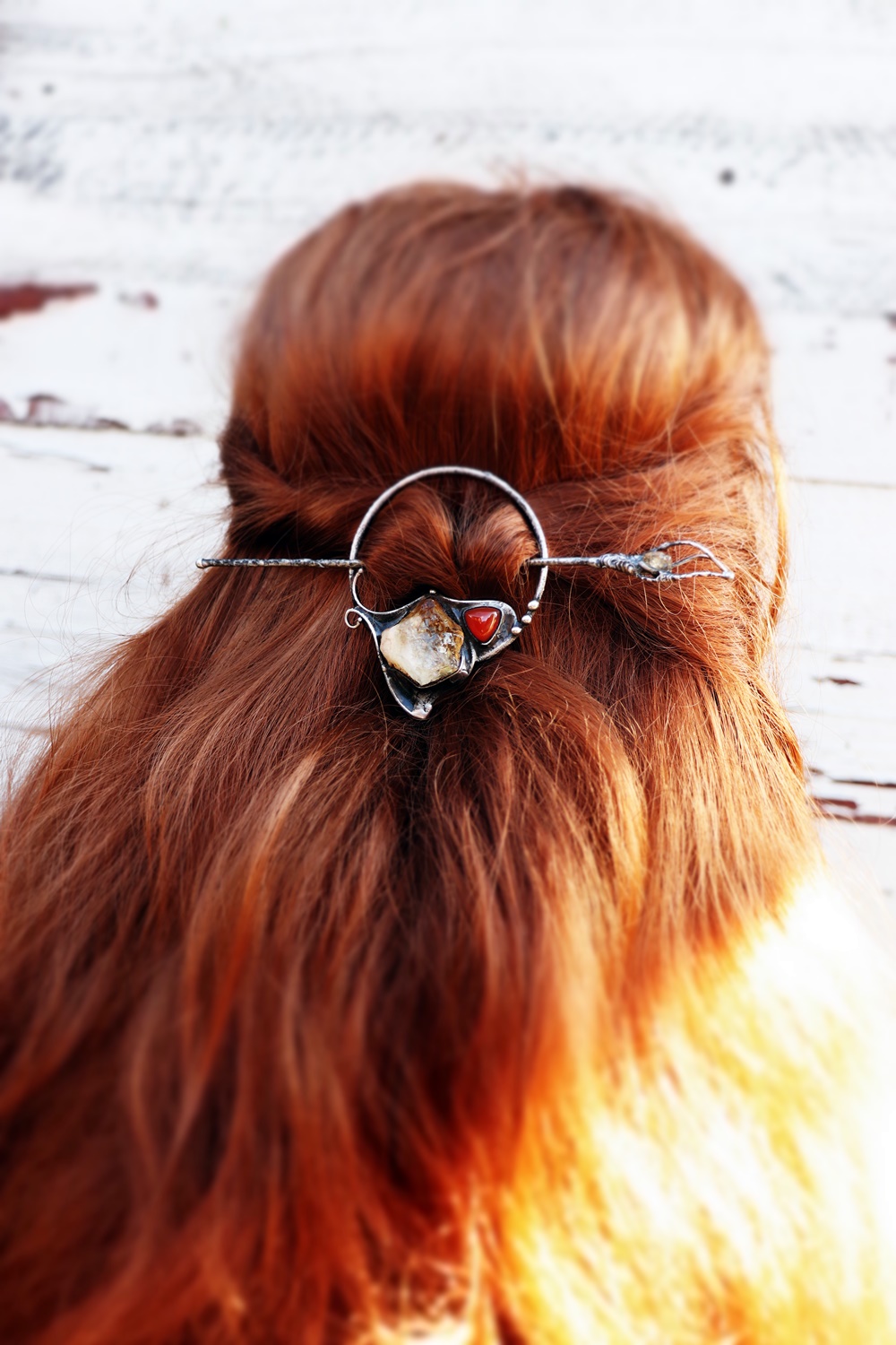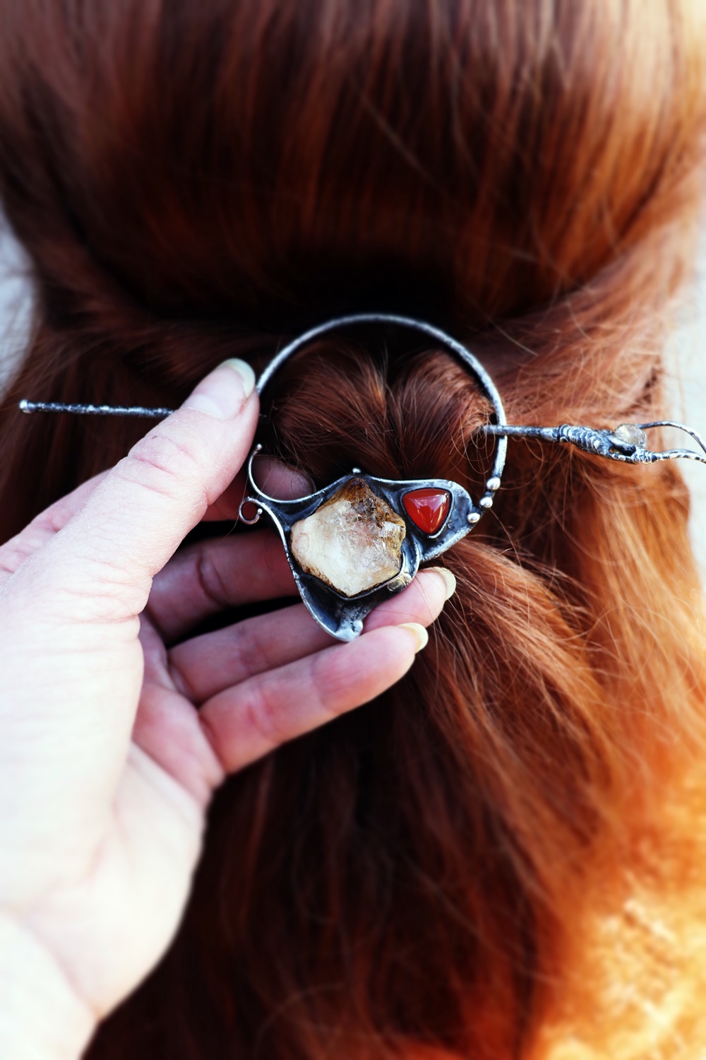 Výrazná kombinace citrínu a karneolu přináší energii, odvahu a chuť do života. Teplé odstíny kamenů krásně vyniknou ve vlasech a dodají účesu jedinečný charakter.